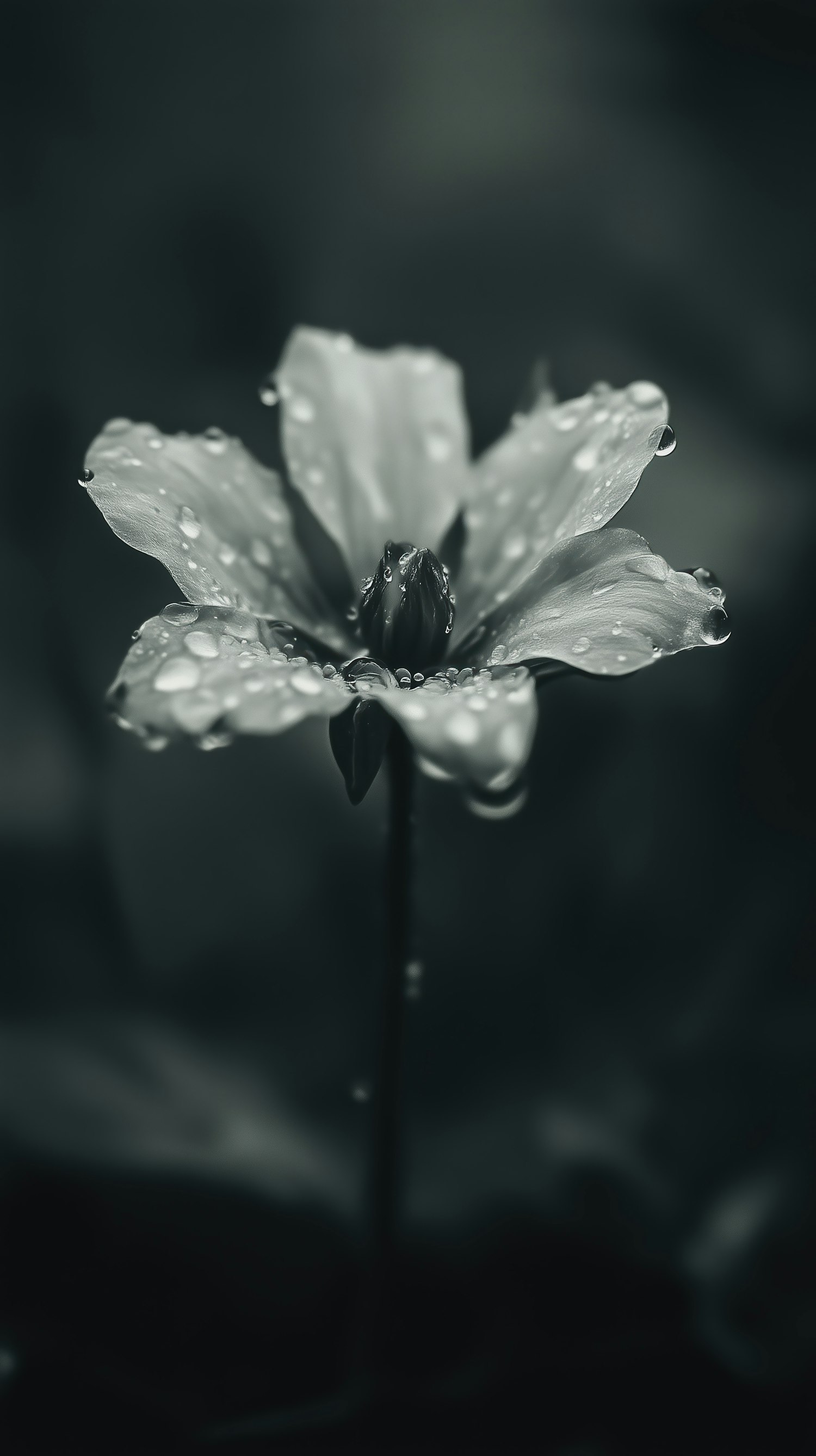 A monochromatic close-up of a flower with water droplets on its petals, set against a blurred dark background for a moody effect.