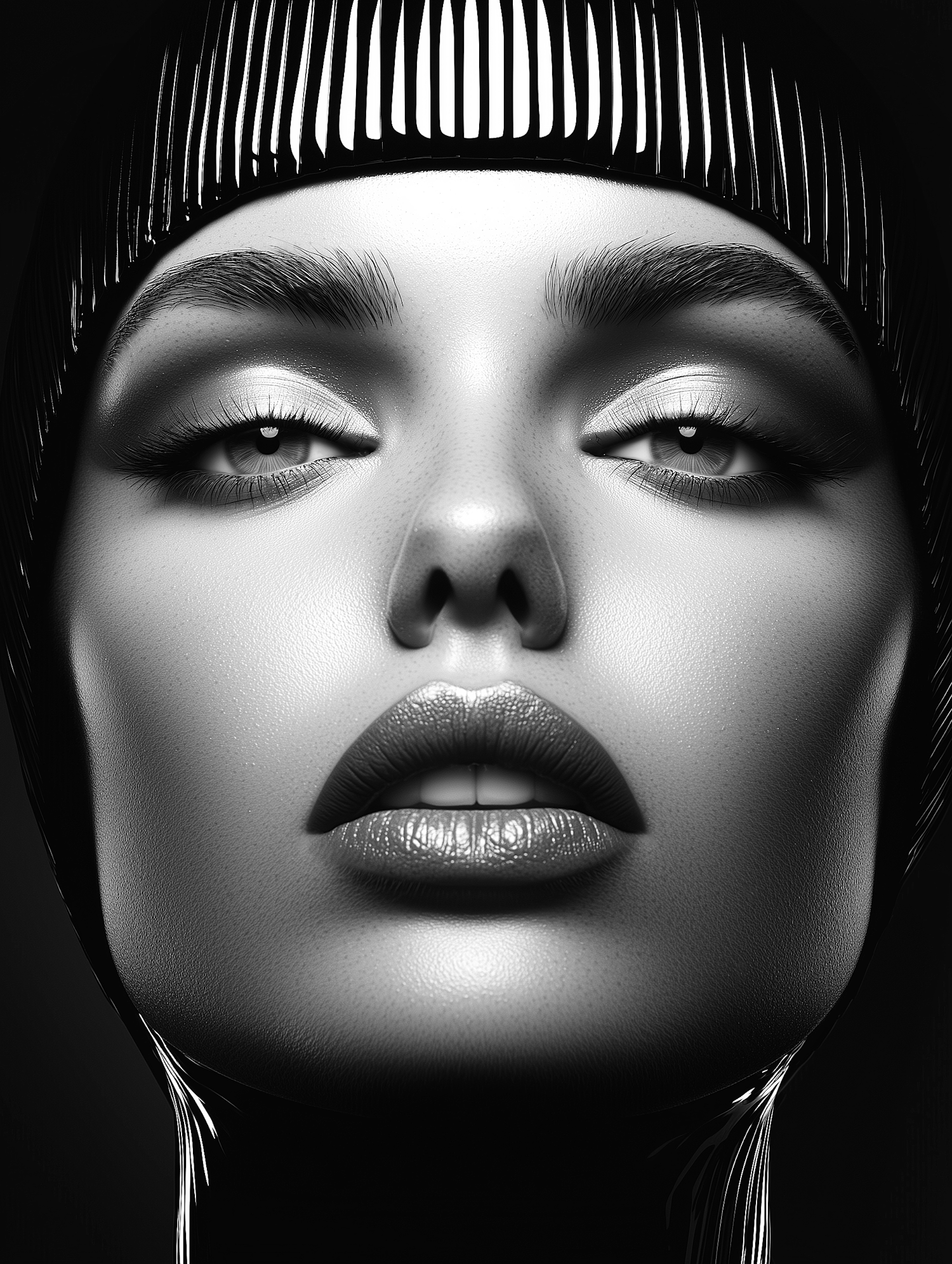 Futuristic black and white portrait with metallic skin texture and sleek headpiece, emphasizing dramatic facial features.