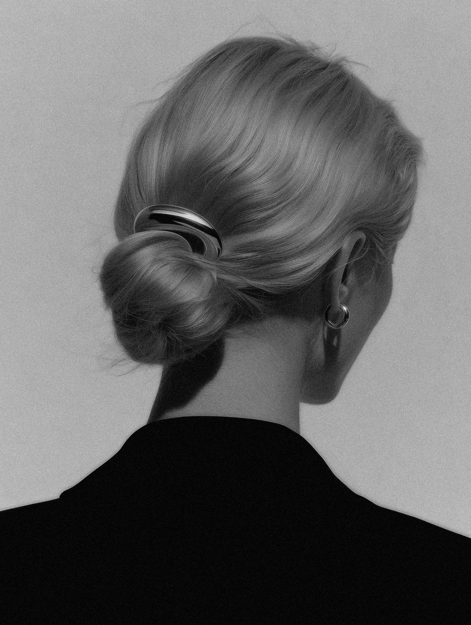 Elegant monochrome portrait of a person with a low bun and metallic hair clip, wearing hoop earrings and a dark blazer.