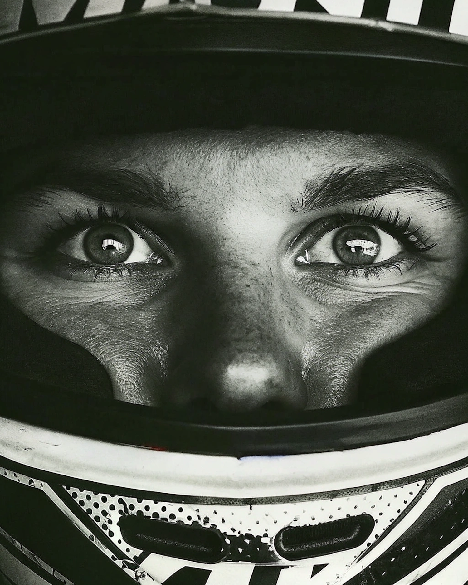 Close-up black-and-white shot of a person's eyes and helmet, showcasing intense focus and intricate details.