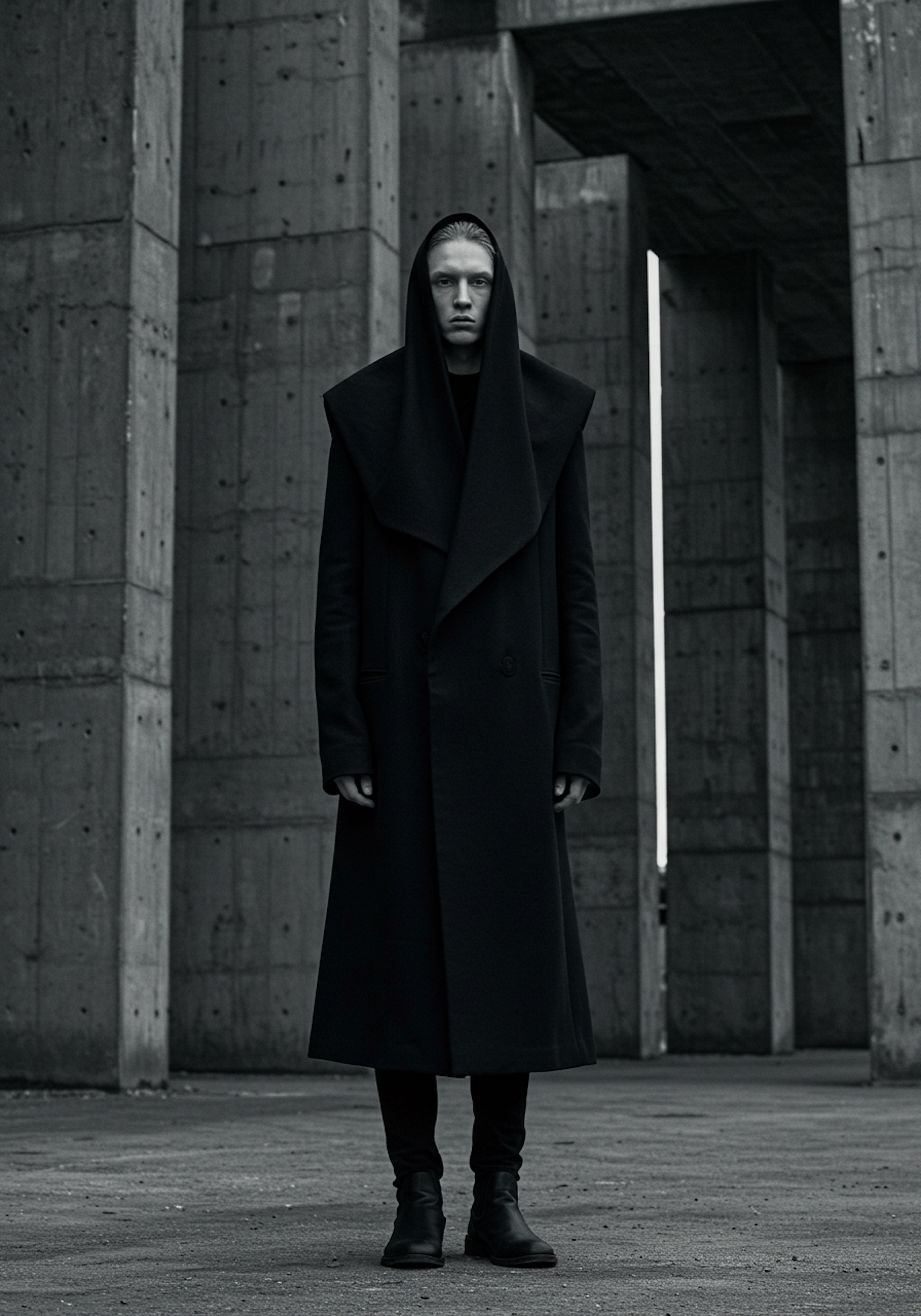 Moody monochrome shot of a person in a dramatic black hooded coat, set against imposing concrete architecture.