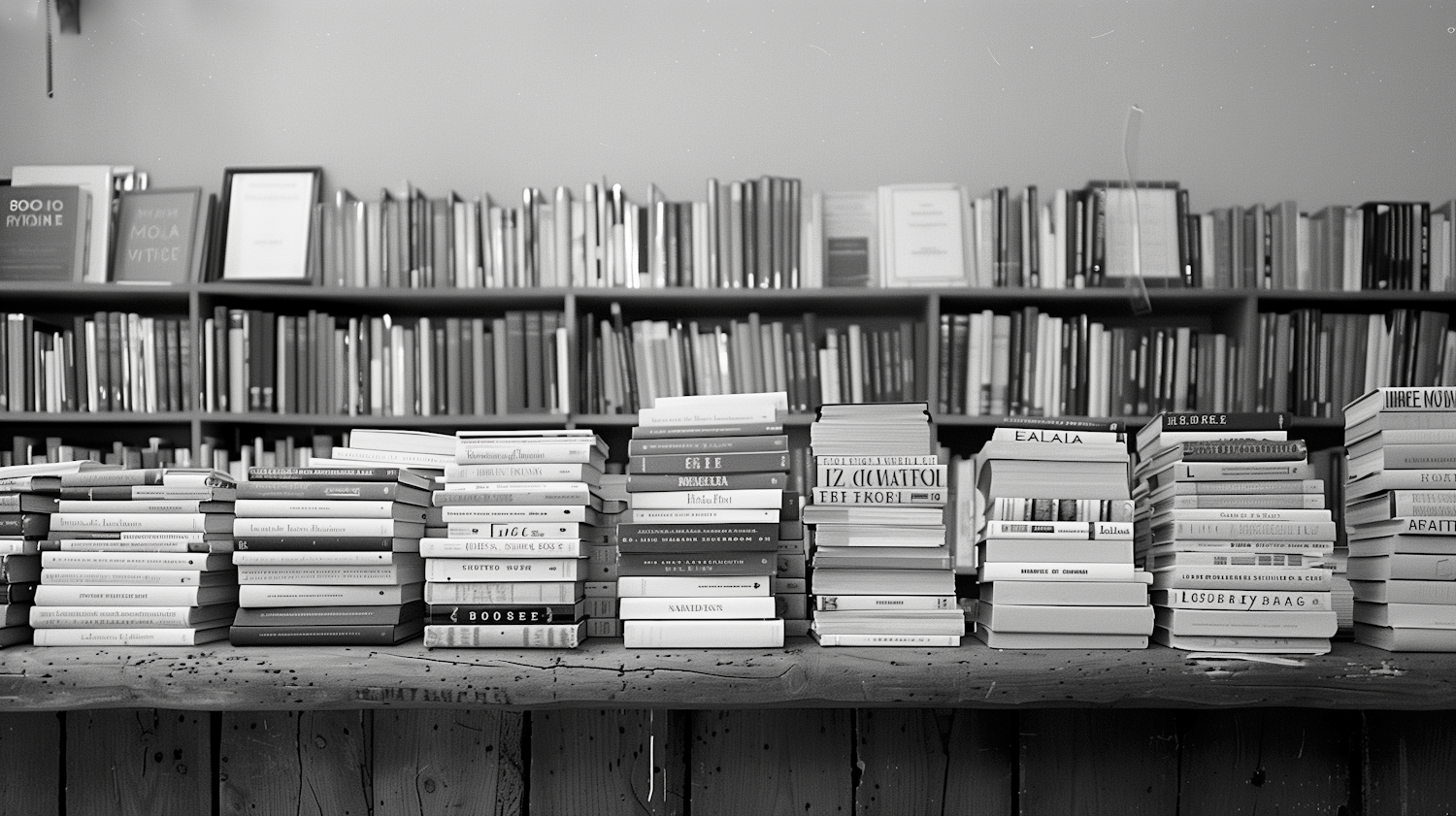 Black and white image of a library with stacks of books on a table and shelves in the background, creating a scholarly atmosphere.
