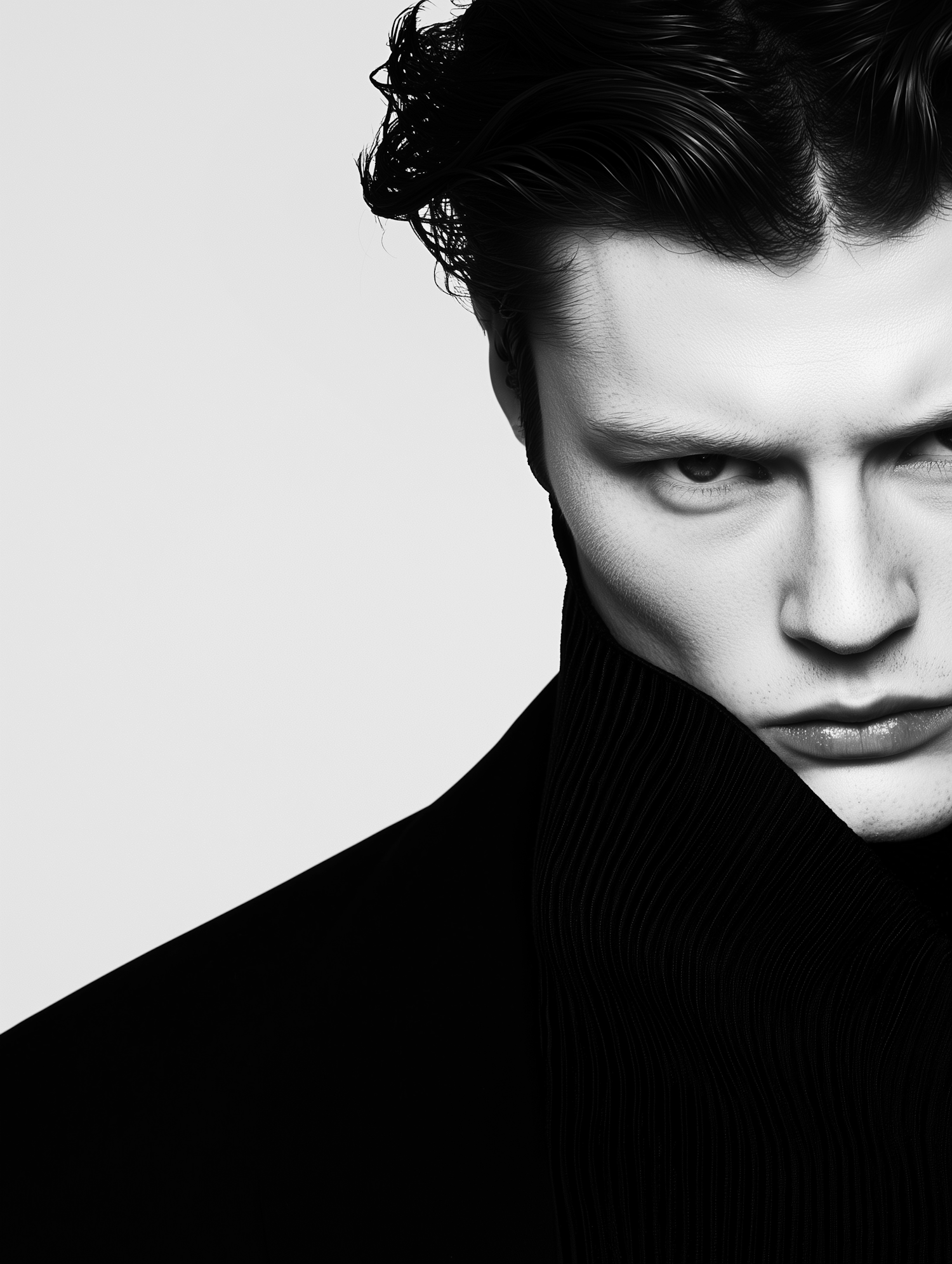 Dramatic black and white portrait of a man with intense gaze, styled hair, and high-collared garment, creating a striking visual contrast.