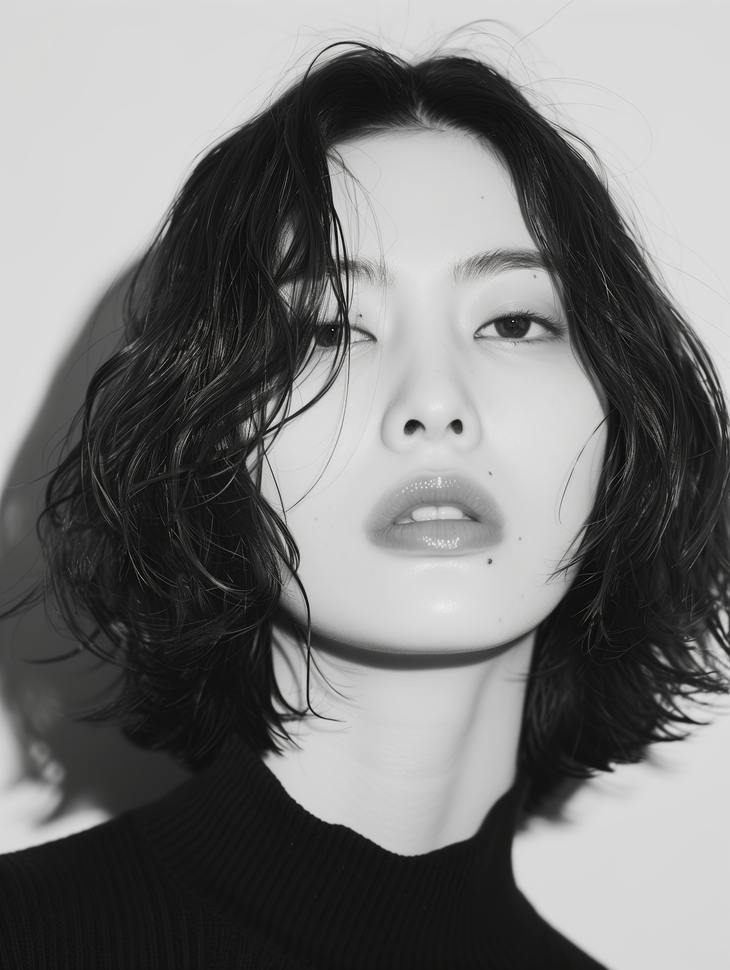 Black and white portrait of an Asian woman with wavy hair, glossy lips, and a beauty mark, wearing a black turtleneck.