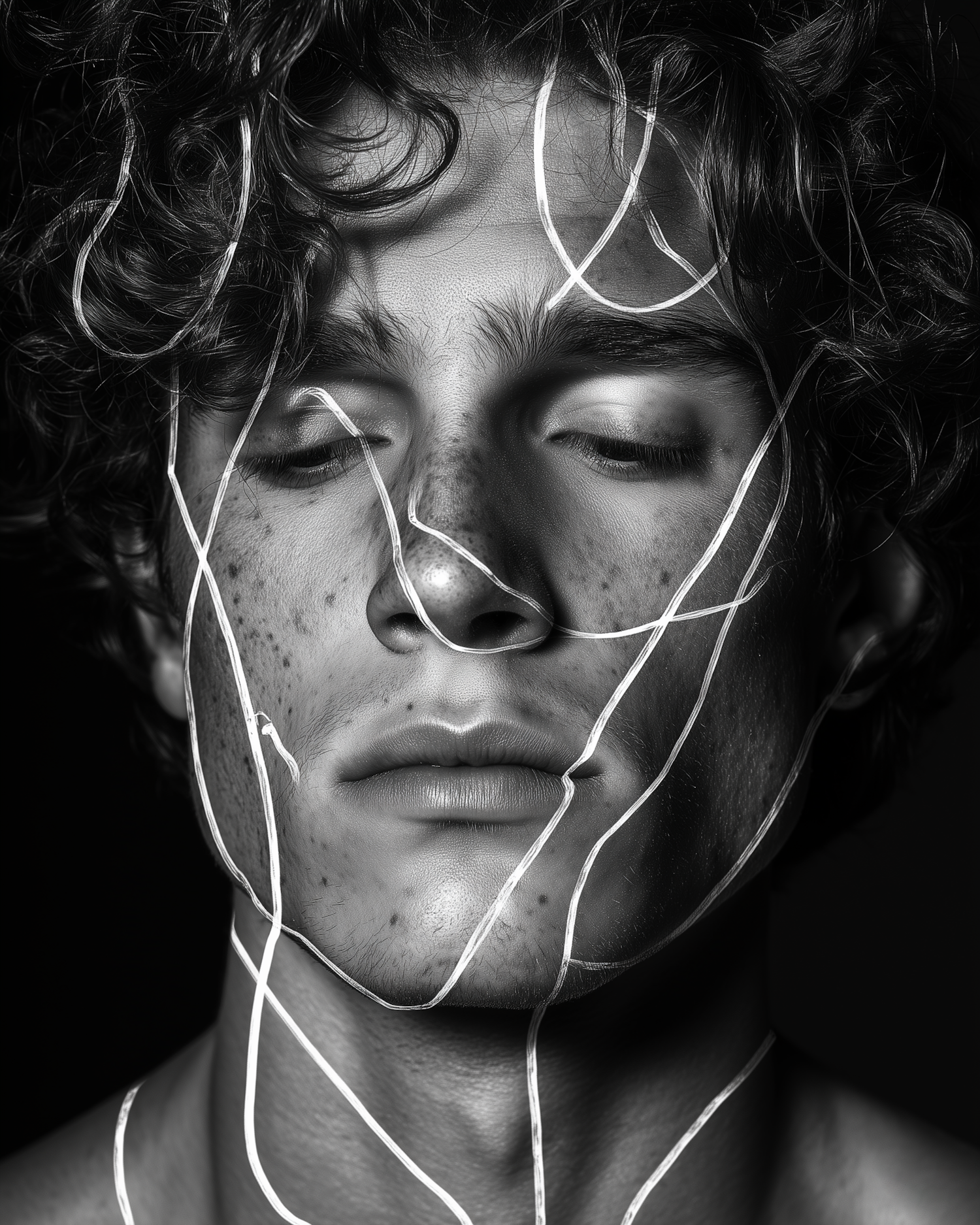 Monochrome portrait of a freckled man with glowing white lines tracing his face, creating a surreal and artistic vibe.