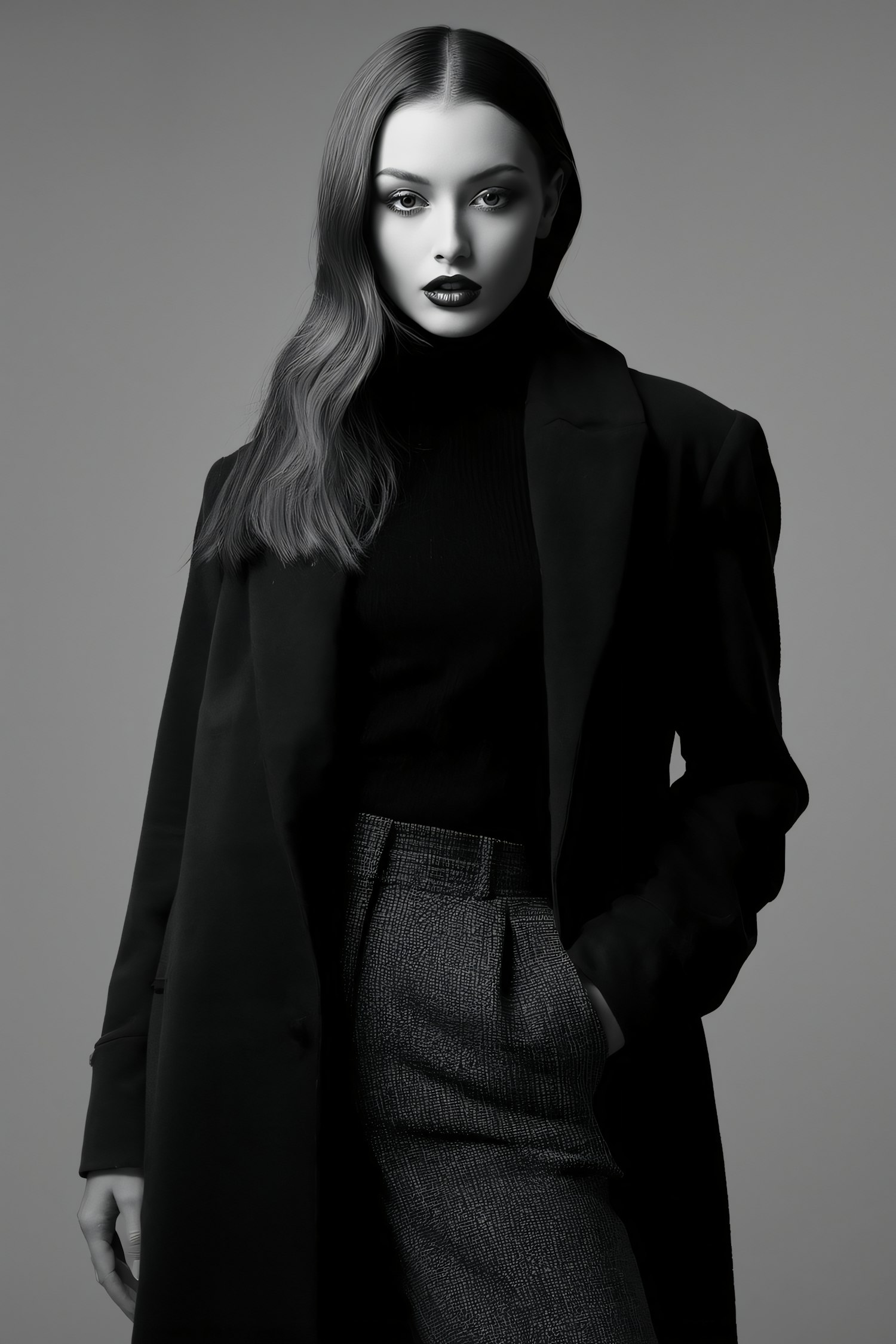 Monochrome portrait of a stylish woman in a tailored coat and textured trousers, with striking makeup and a neutral expression.
