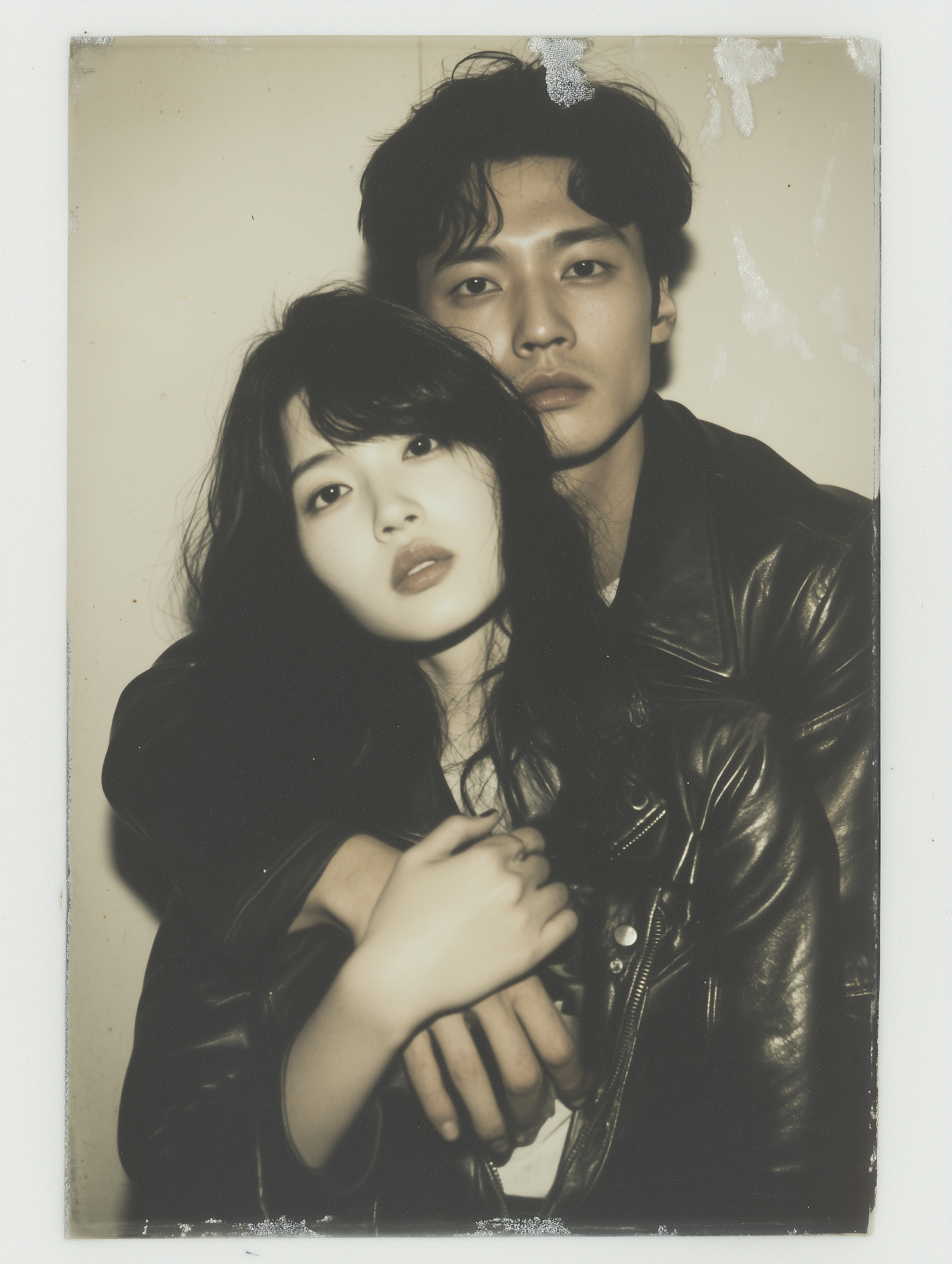 A monochrome portrait of a man and woman in leather jackets, showcasing a close and intimate pose with a vintage aesthetic.