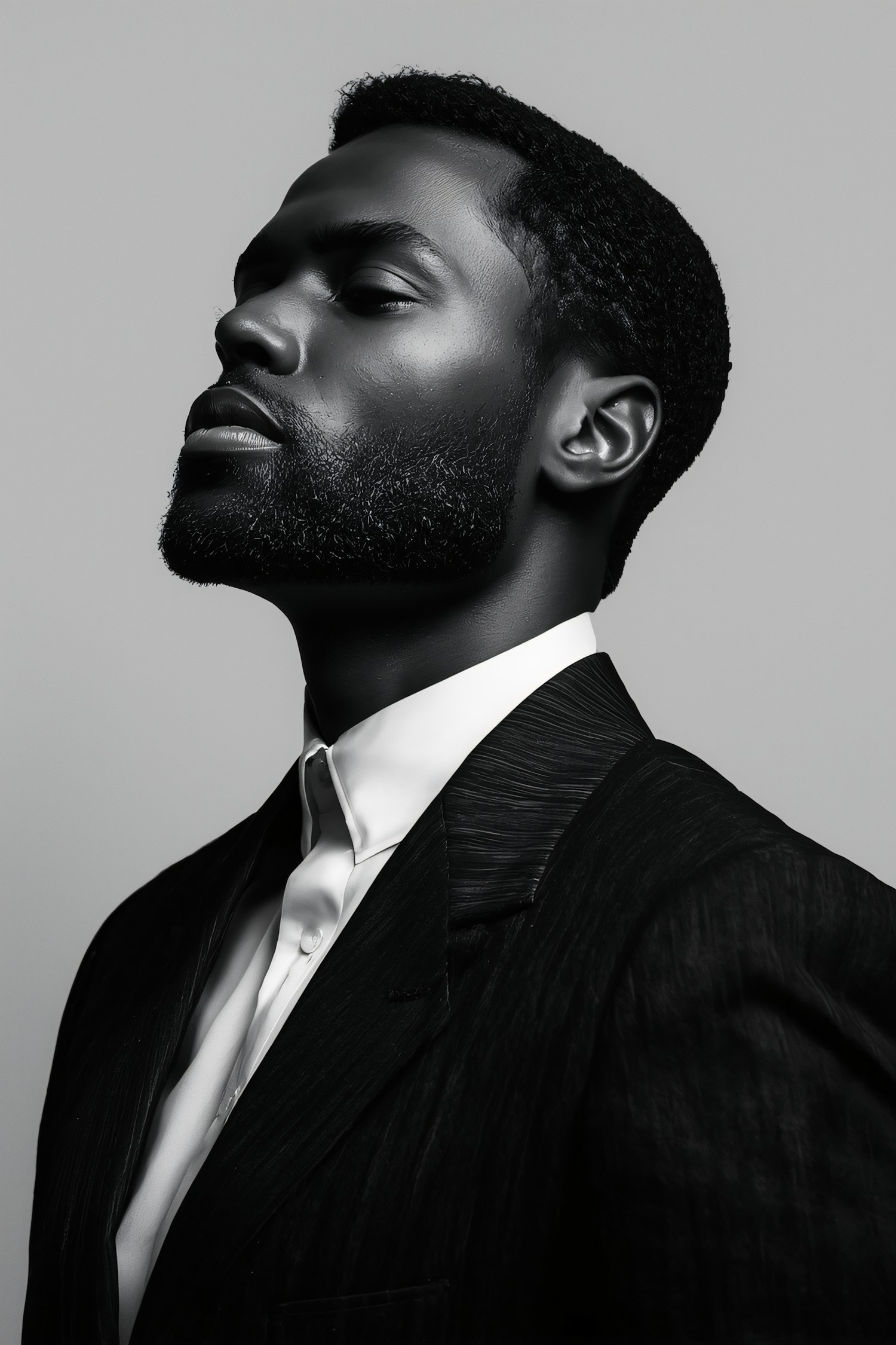 Monochrome portrait of a man in a suit, showcasing sharp features and a confident pose against a neutral background.