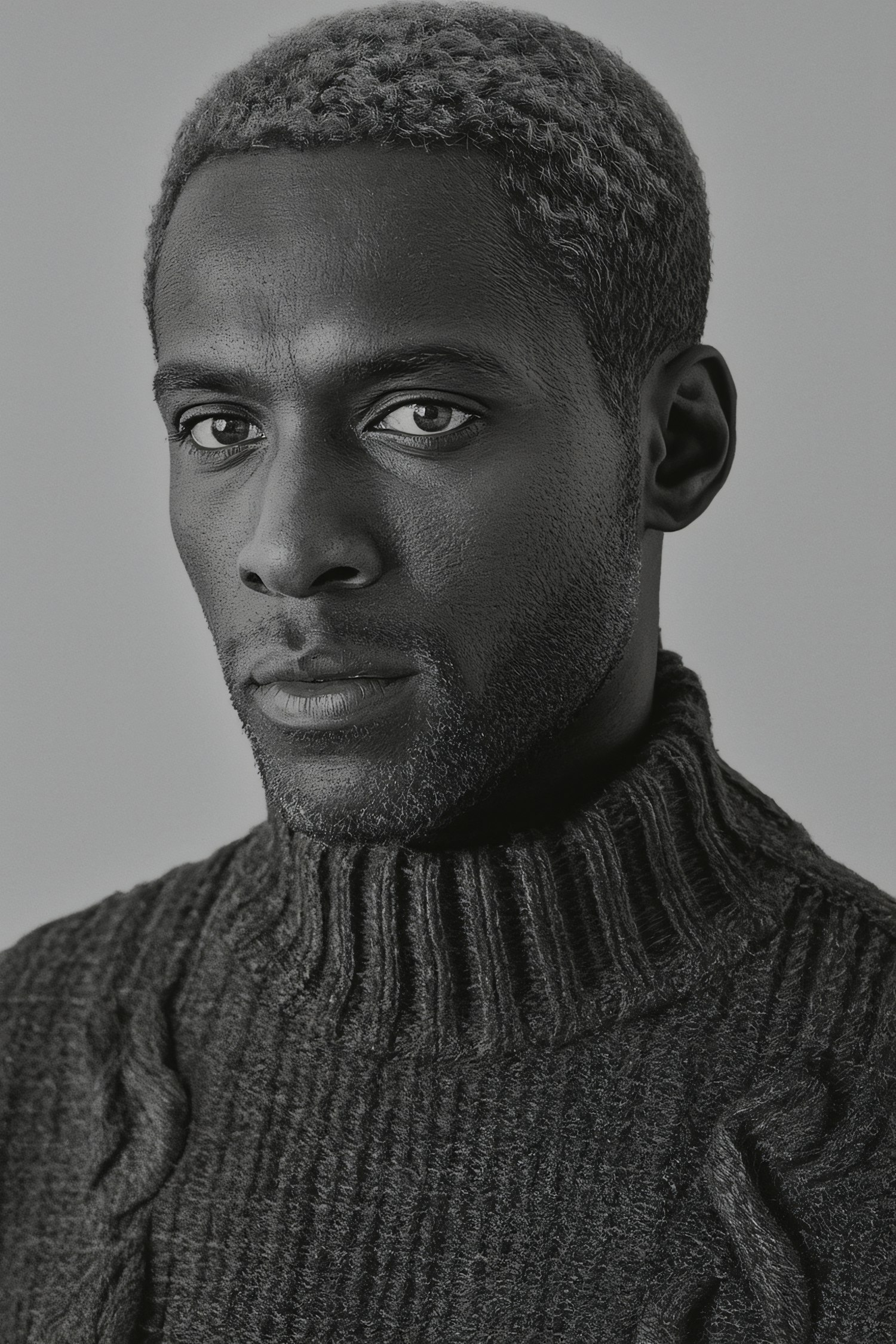 Monochrome portrait of a man in a textured sweater, gazing directly at the camera with a calm expression.