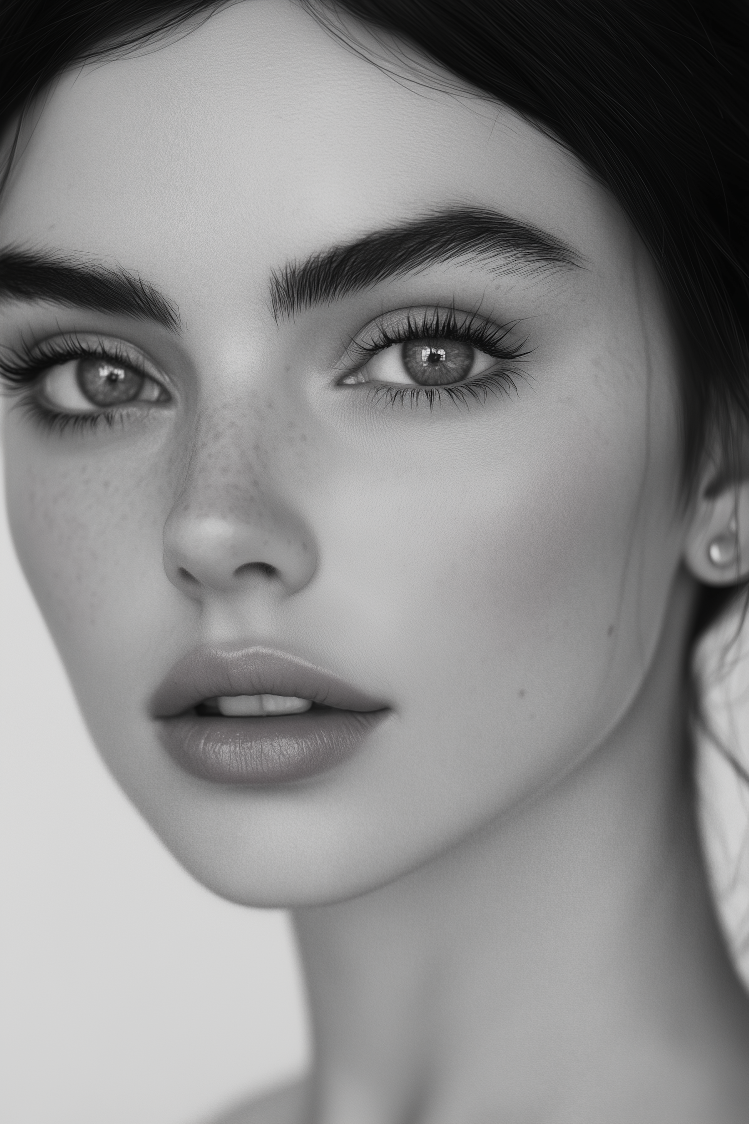 Black-and-white close-up of a young woman with freckles, striking eyes, and soft features, showcasing natural beauty and elegance.