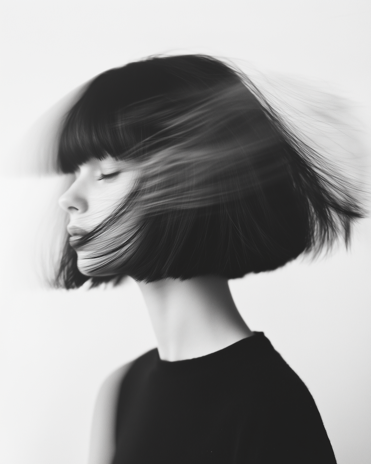 Black and white portrait of a woman with a bob haircut, hair in motion, eyes closed, creating a serene and dynamic effect.