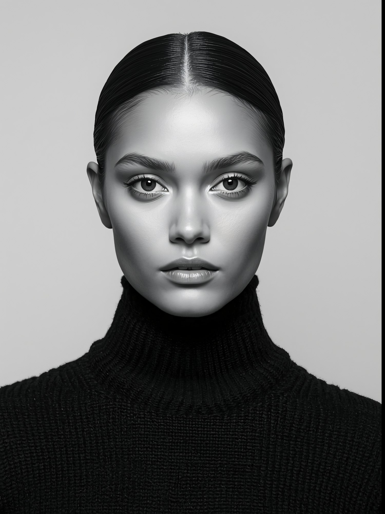 Monochrome portrait of a woman with sleek hair and a black sweater, showcasing striking facial features and a neutral expression.