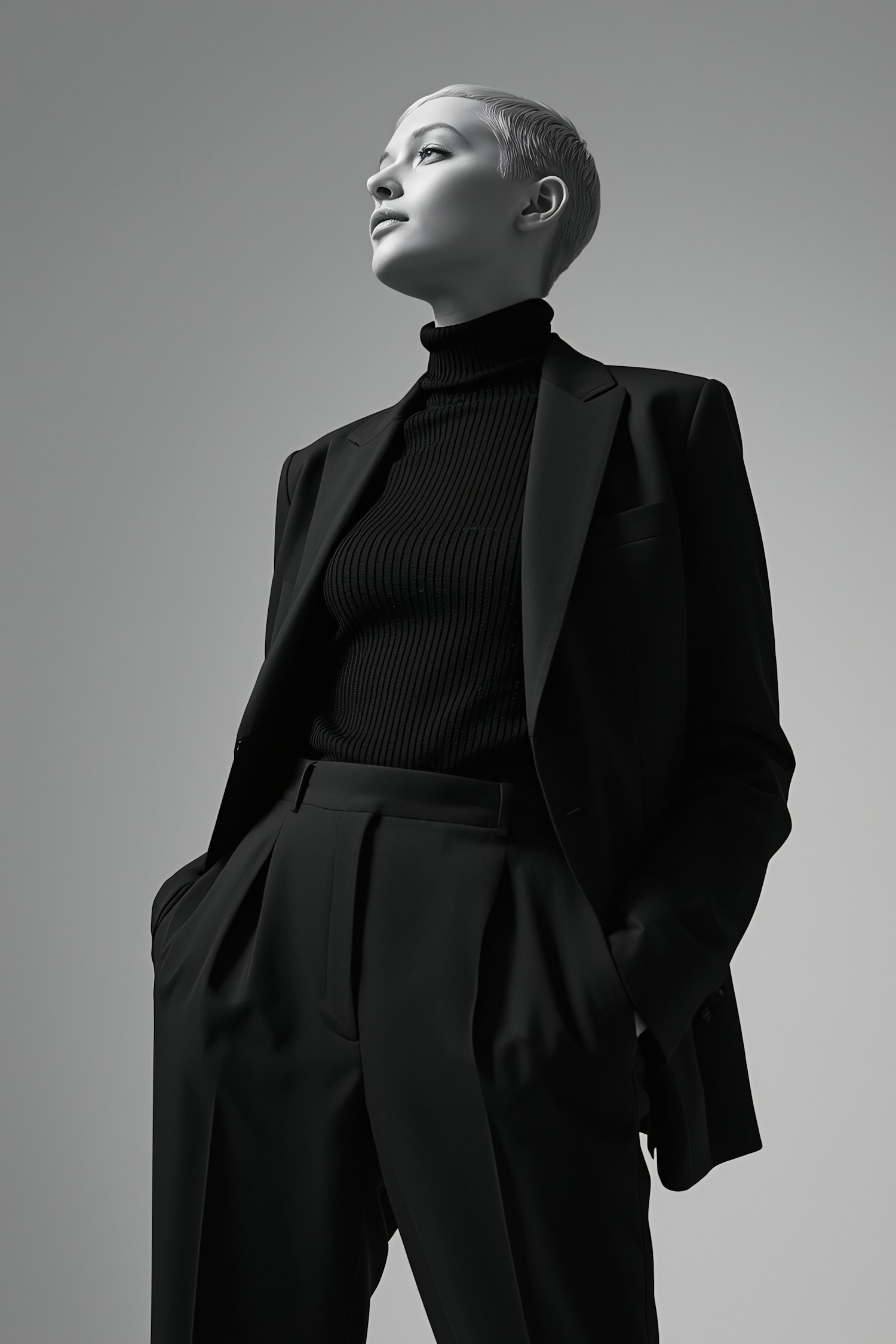 Monochrome portrait of a person in a black suit and turtleneck, exuding confidence with a clean, minimalistic background.
