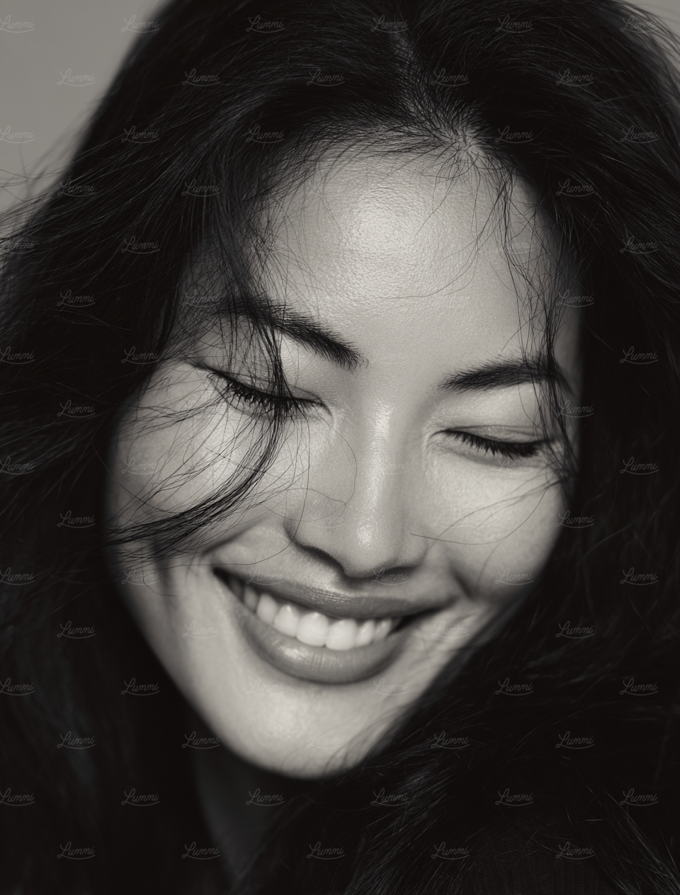Black-and-white close-up of a smiling woman with closed eyes, her hair framing her face naturally, exuding warmth and joy.