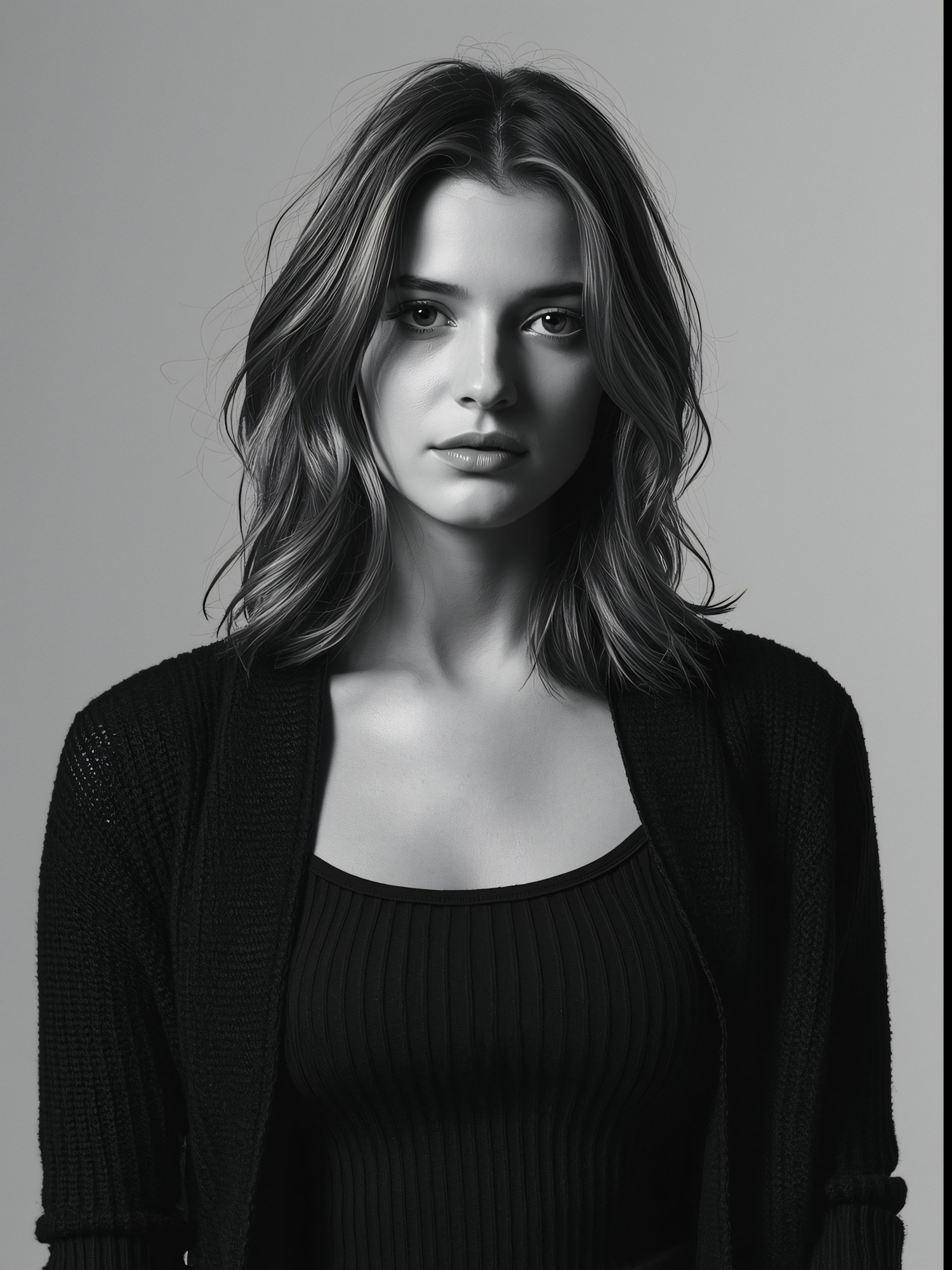 Monochrome portrait of a young woman with wavy hair, wearing a ribbed tank top and cardigan, looking directly at the camera.