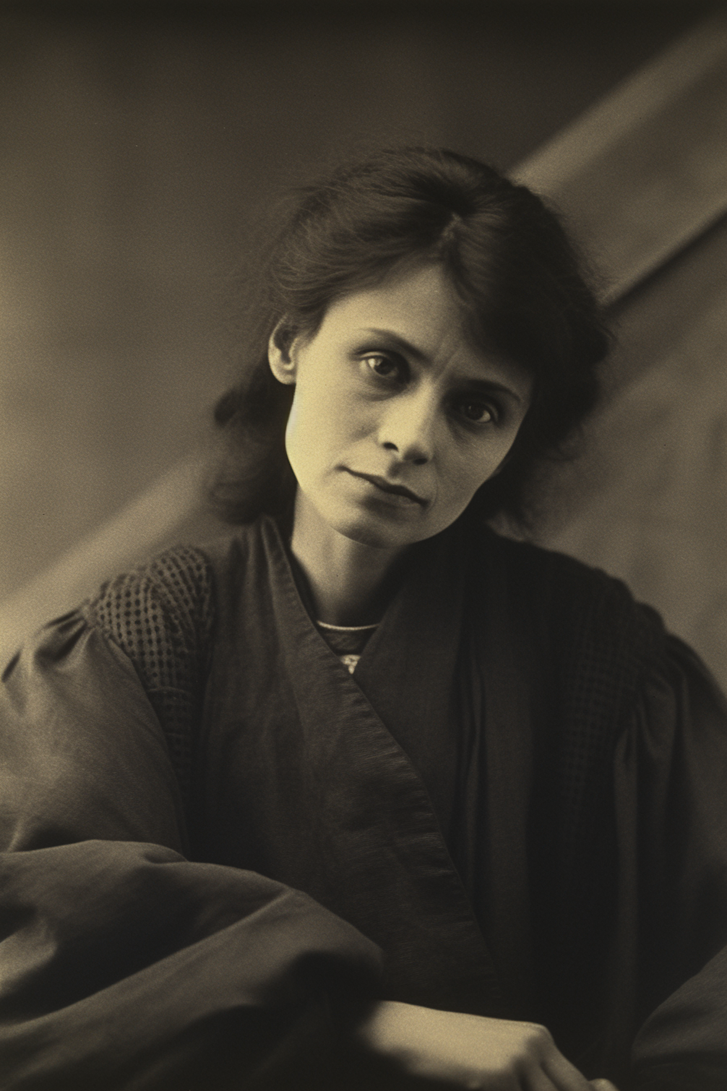 Sepia-toned portrait of a woman with dark hair and contemplative gaze, dressed in a modest textured garment, evoking a vintage feel.