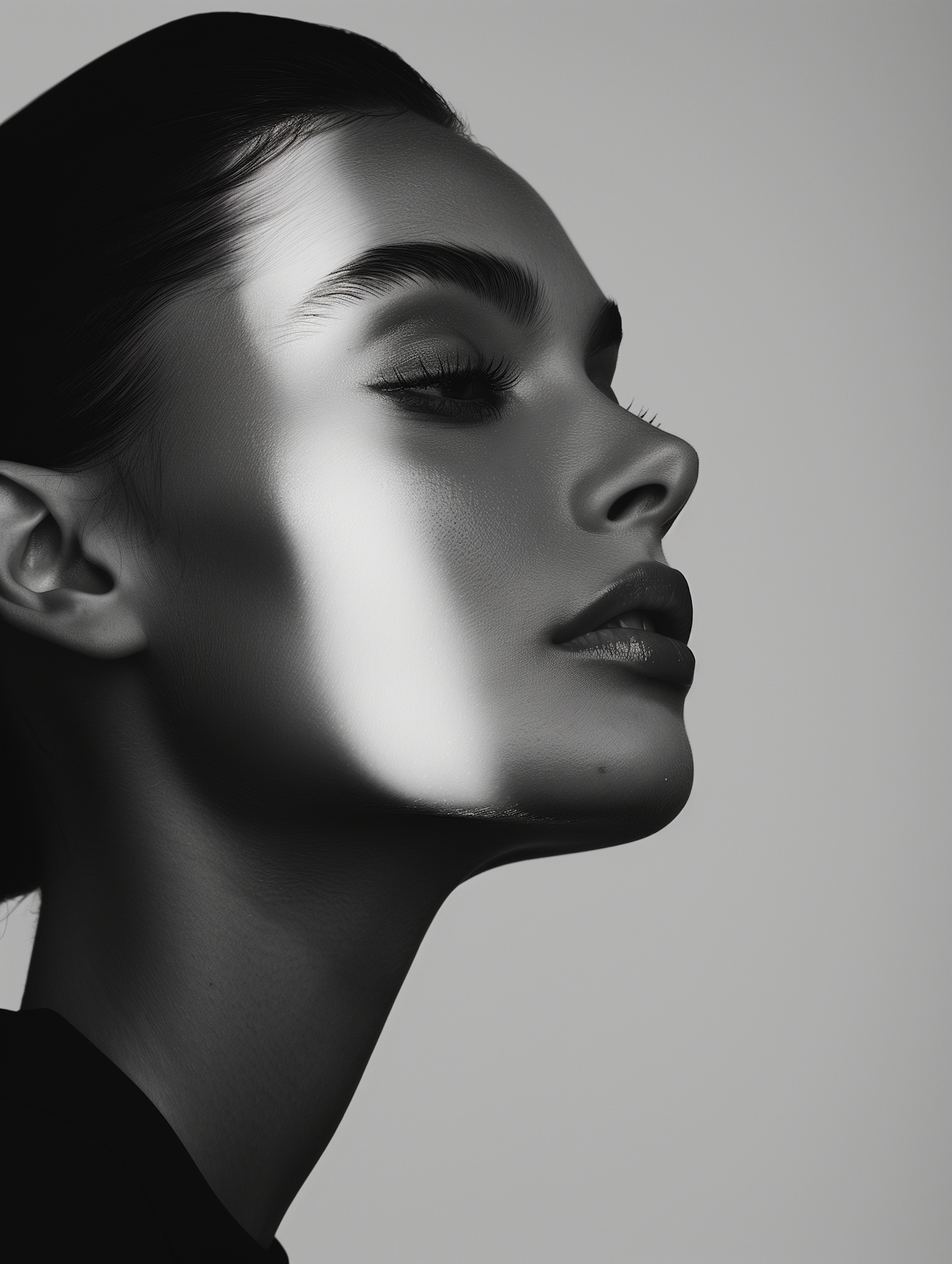 Elegant black and white portrait of a woman with dramatic lighting and striking profile, highlighting her features and contours.