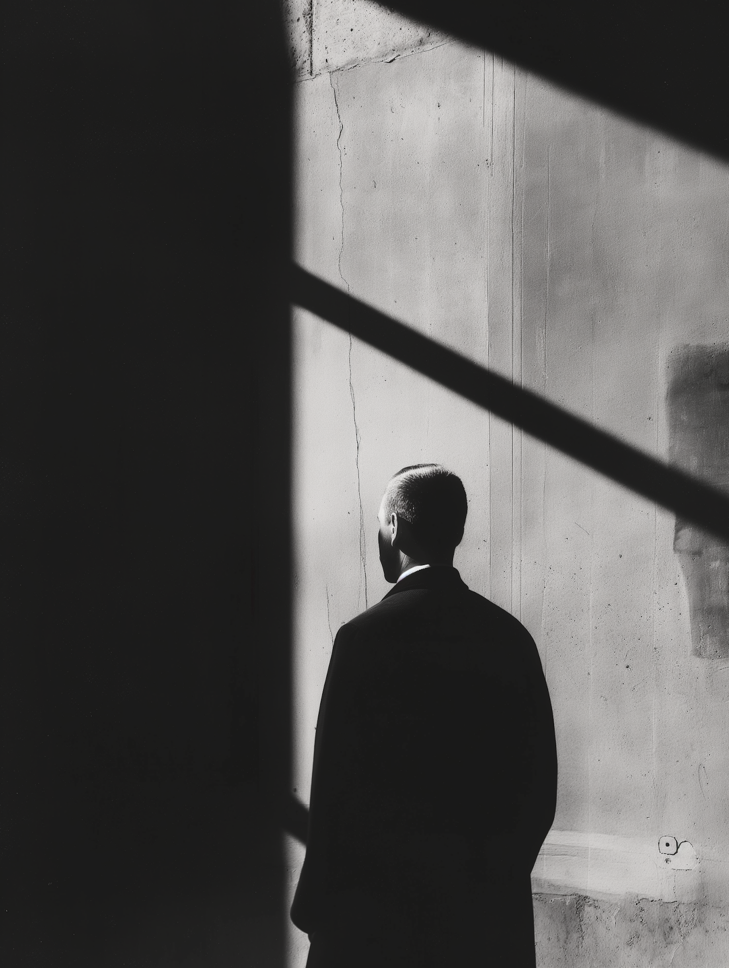 Black and white photo of a man in a suit standing in shadows, facing a textured wall. Dramatic lighting creates a mysterious atmosphere.