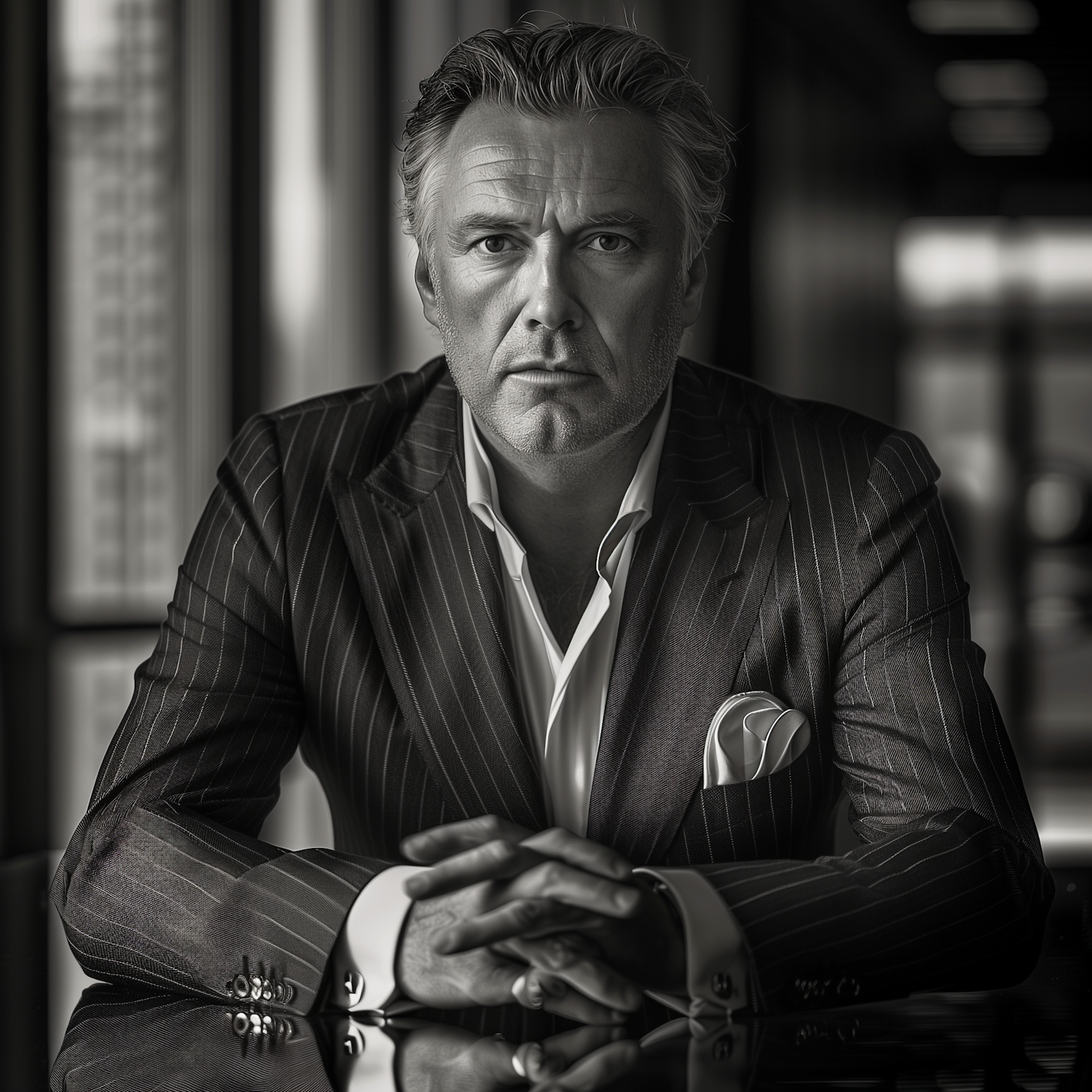 Middle-aged man in a pinstripe suit sits confidently at a table, exuding authority and focus in a softly lit office setting.