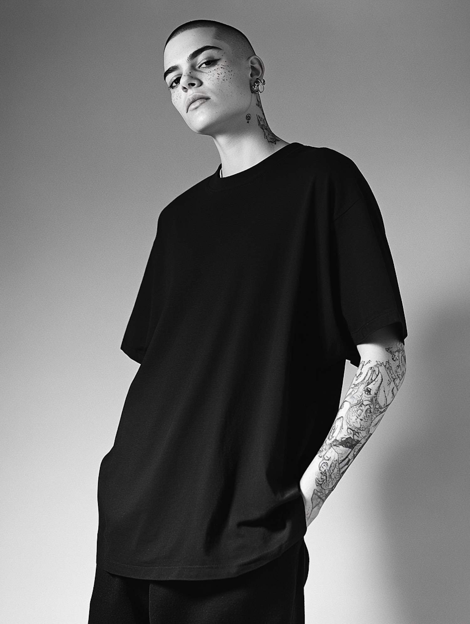 Stylish individual with tattoos and shaved head in black T-shirt, exuding confidence in a monochrome setting.
