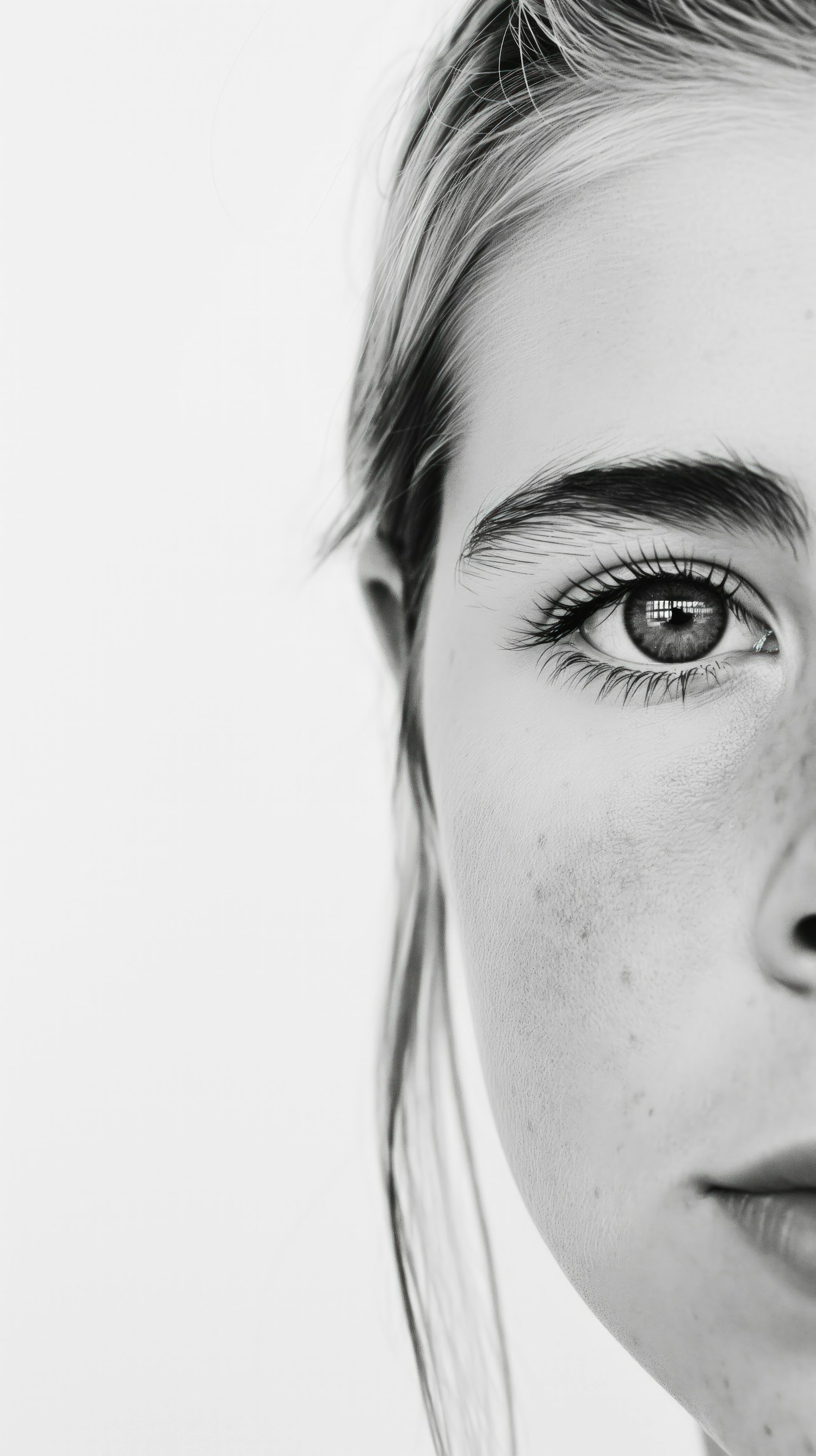 Black and white close-up of a young woman's face, highlighting her eye, freckles, and natural features against a plain background.