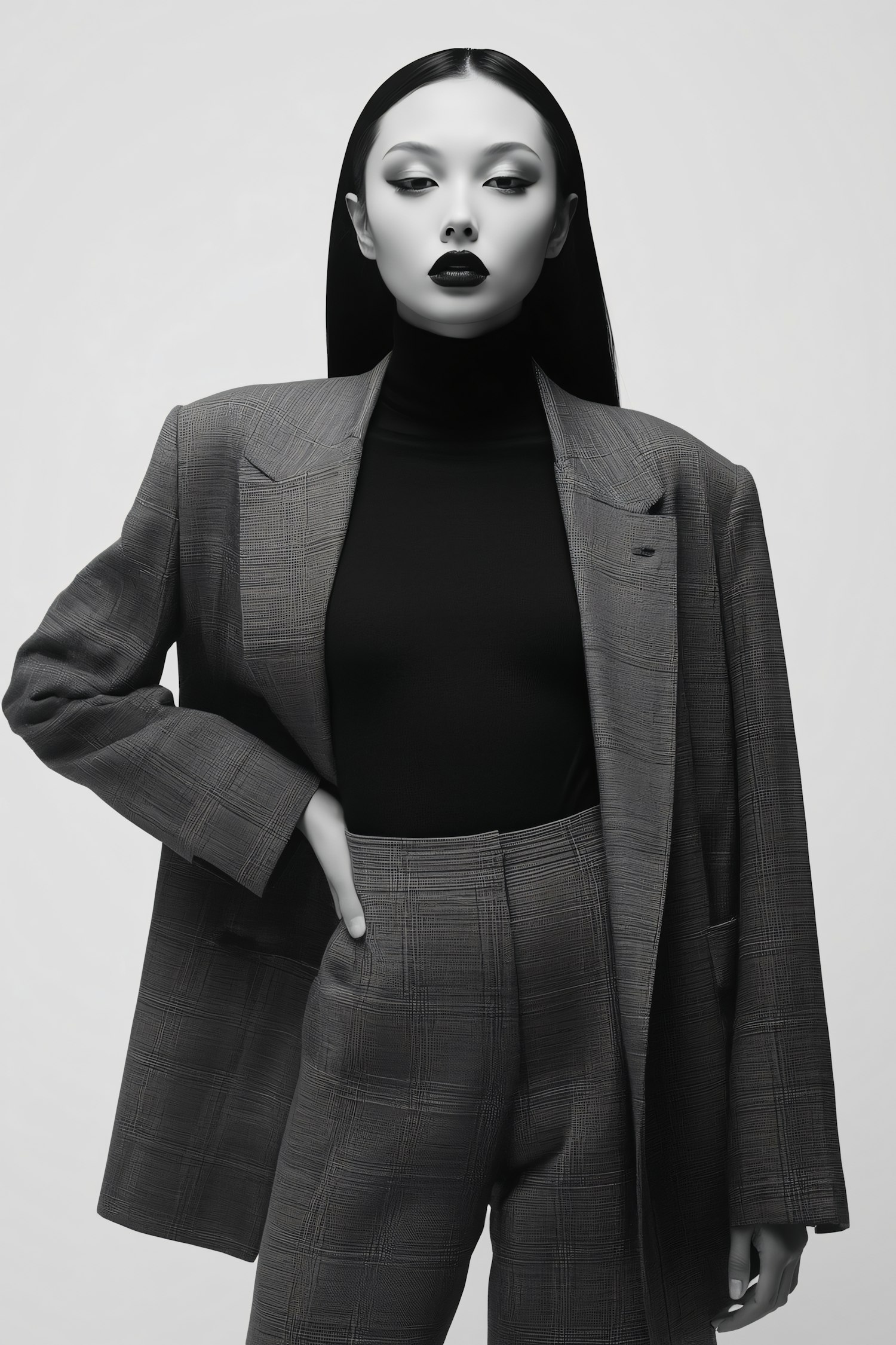Monochrome portrait of a person in a plaid suit and black turtleneck, exuding elegance and confidence with sleek styling and bold makeup.