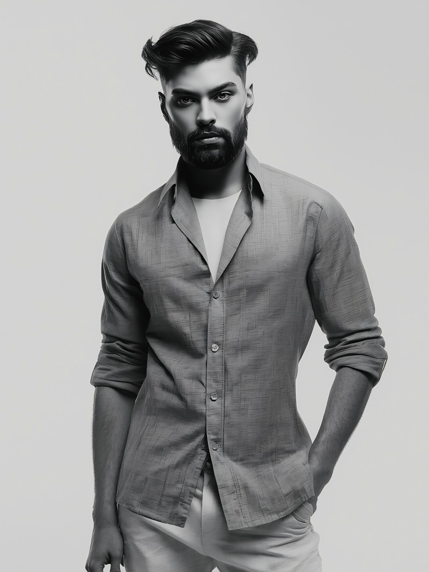 Monochrome portrait of a stylish man with a beard, wearing a button-up shirt and trousers, standing confidently against a plain background.
