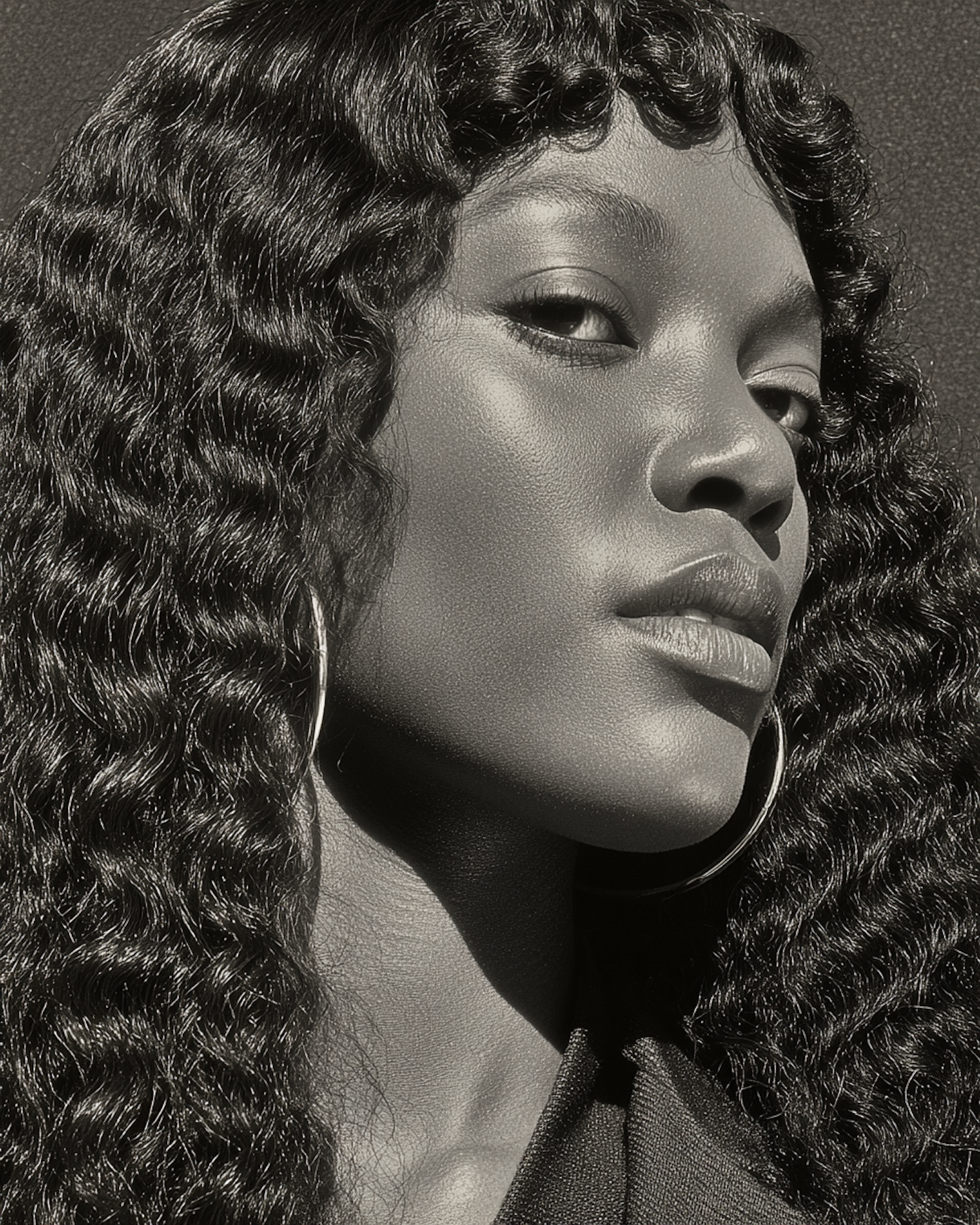 Monochrome portrait of a person with wavy hair, hoop earrings, and a confident expression, emphasizing texture and lighting.