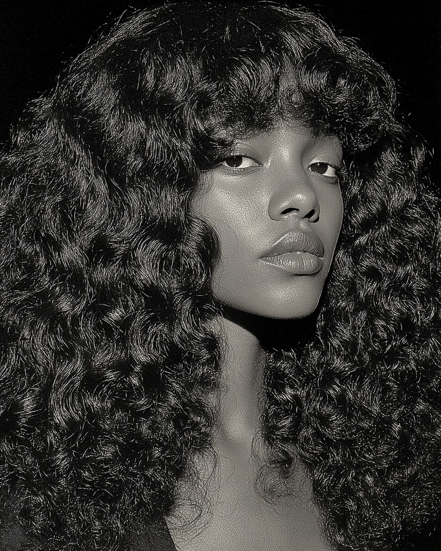 Monochrome portrait of a person with voluminous curly hair, calm expression, and striking lighting emphasizing texture and contrast.