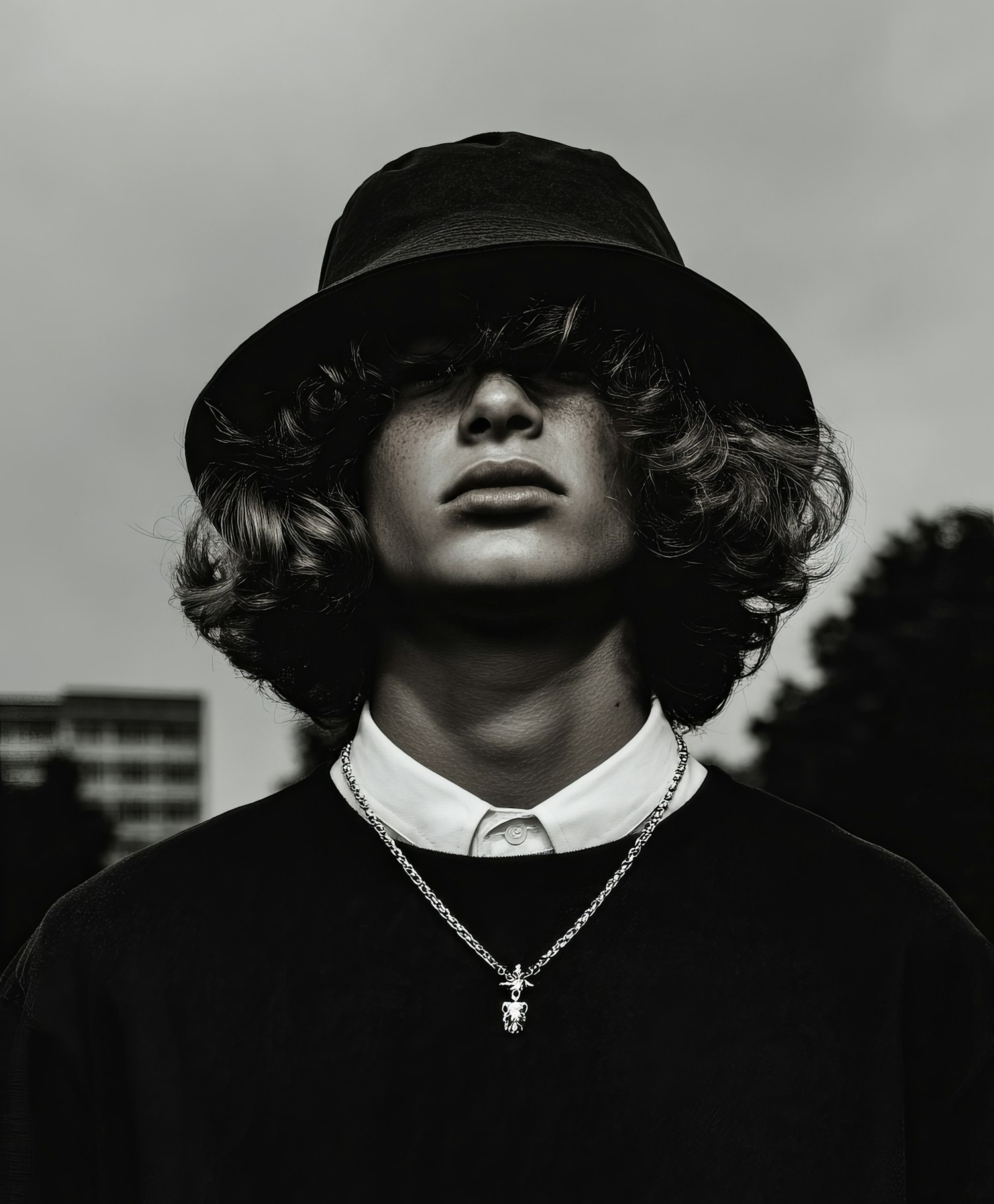 Monochrome portrait of a young person in a bucket hat, white collared shirt, and chain necklace, with a blurred urban background.