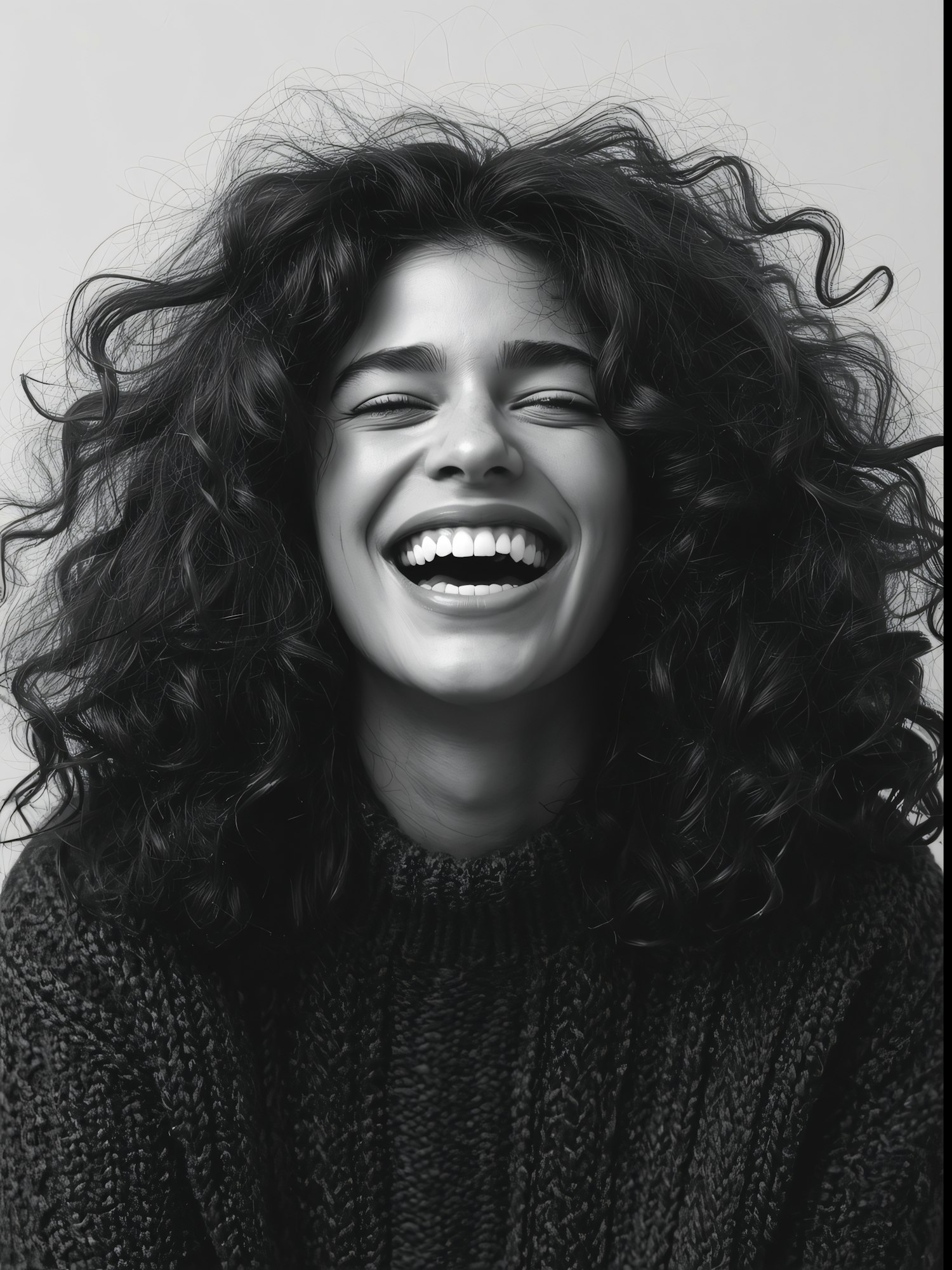 Monochrome portrait of a person with curly hair and a big smile, wearing a textured sweater, radiating joy and warmth.
