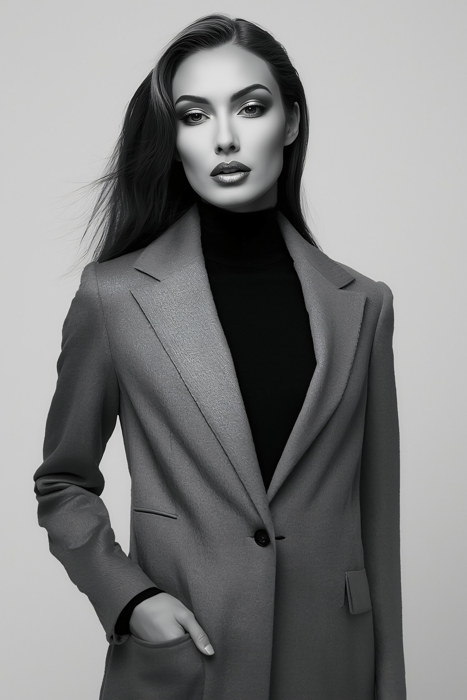 Monochrome portrait of a poised woman in a tailored blazer and turtleneck, with striking lighting and a plain background.