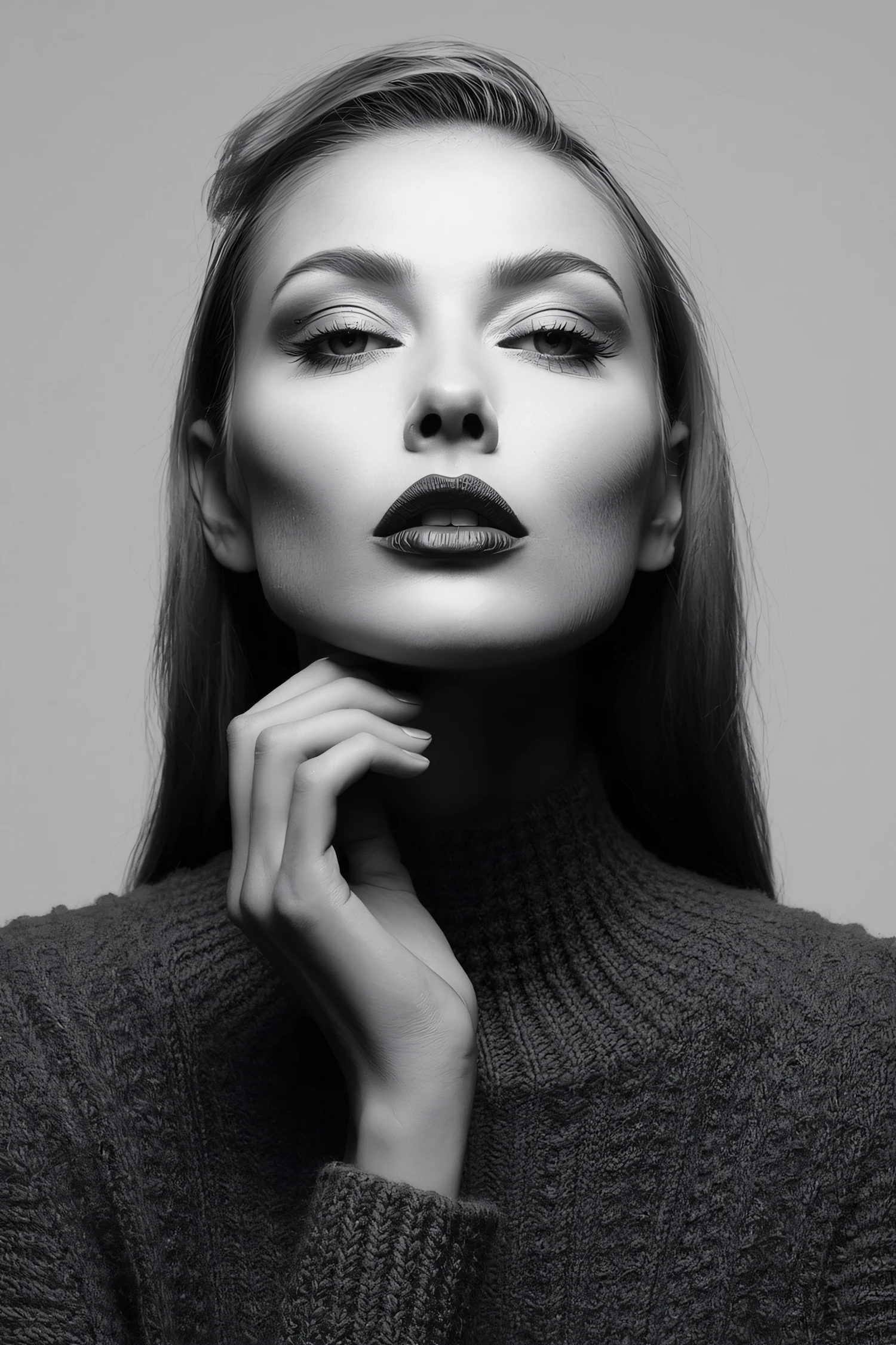 Monochrome portrait of a woman with bold makeup, wearing a knit sweater, and posing thoughtfully with her hand under her chin.