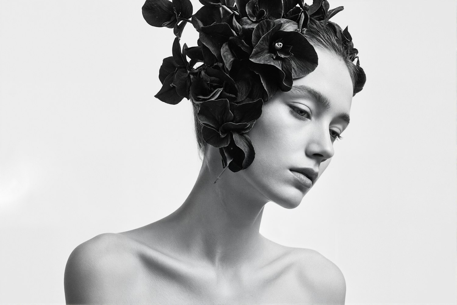 Monochrome Portrait with Floral Adornment