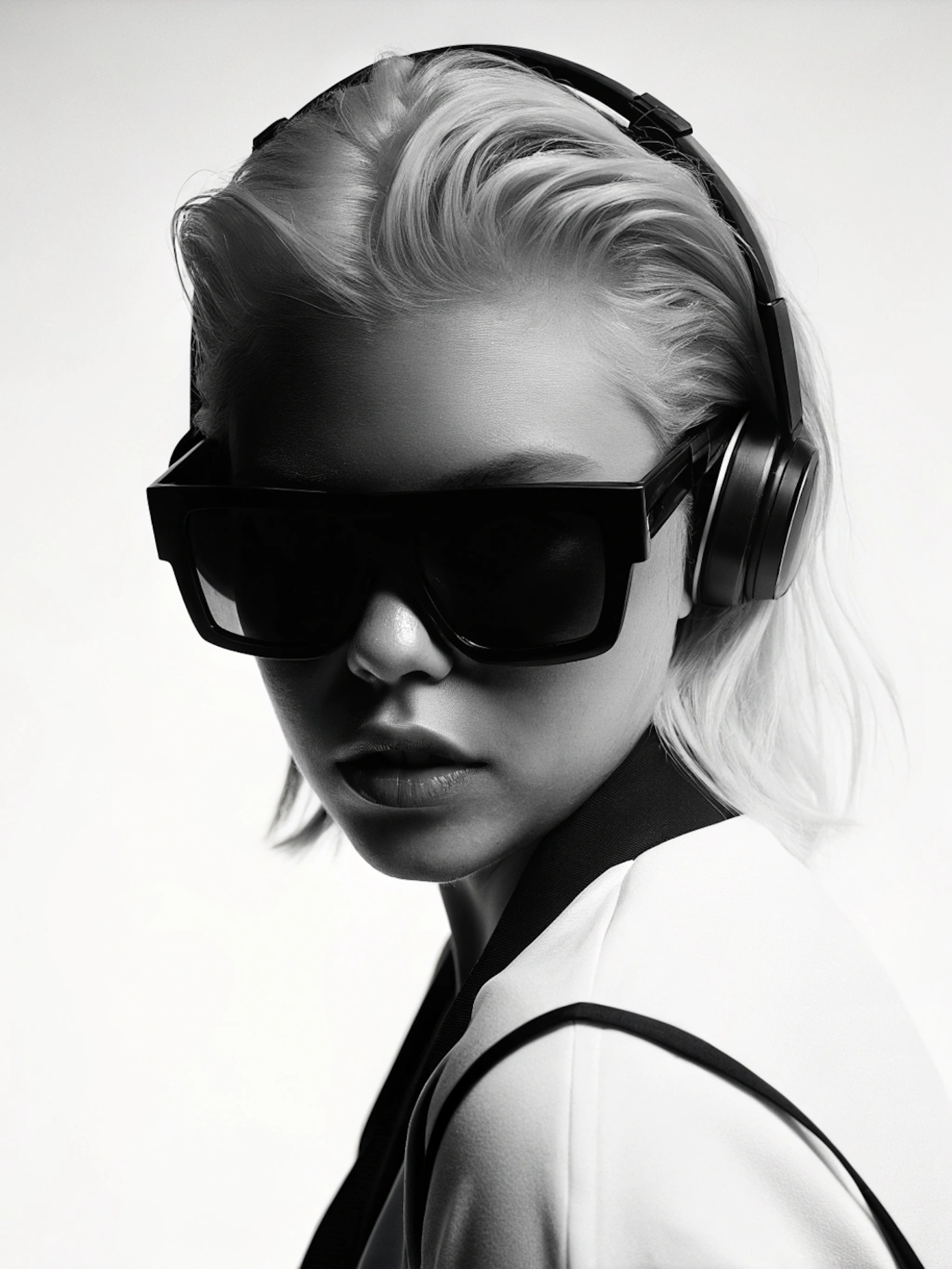 Stylish black and white portrait of a person with sunglasses and headphones, exuding a modern and sleek vibe.