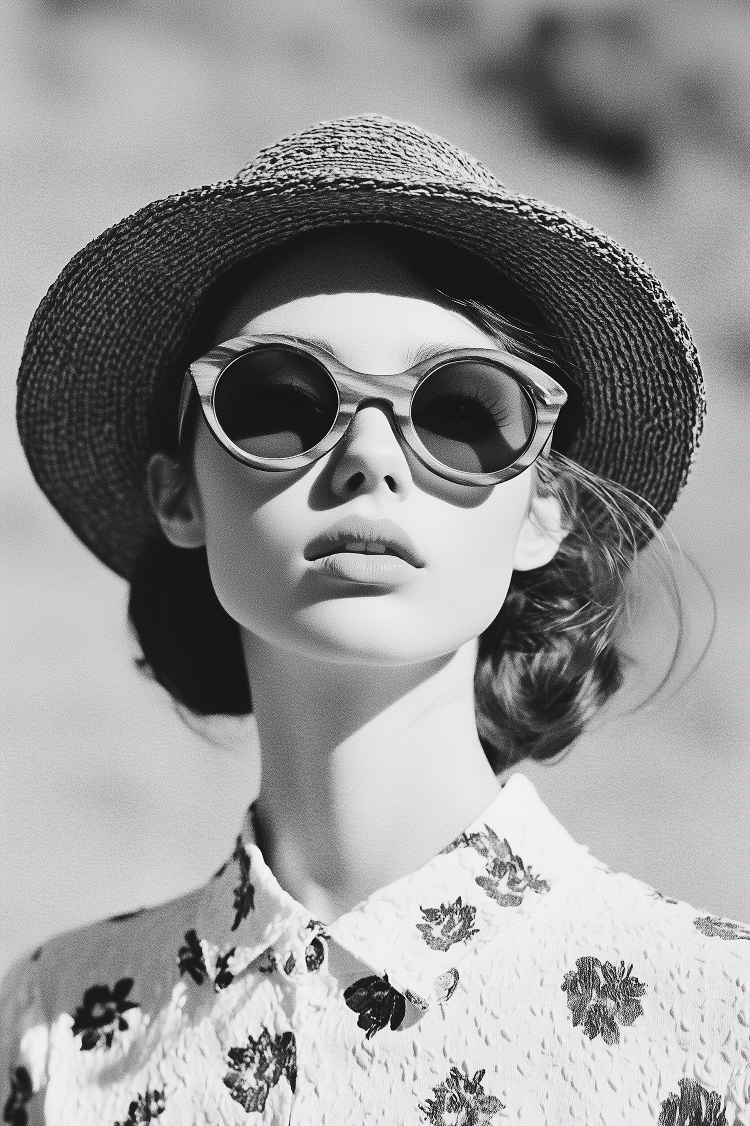 Stylish black and white portrait of a woman in a straw hat and sunglasses, wearing a floral blouse. Elegant and timeless fashion.