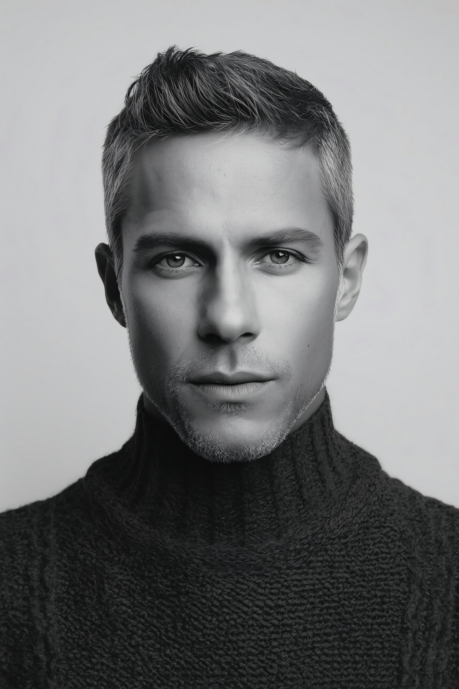 Monochrome portrait of a man in a textured sweater, showcasing a neutral expression and soft lighting for a striking visual.