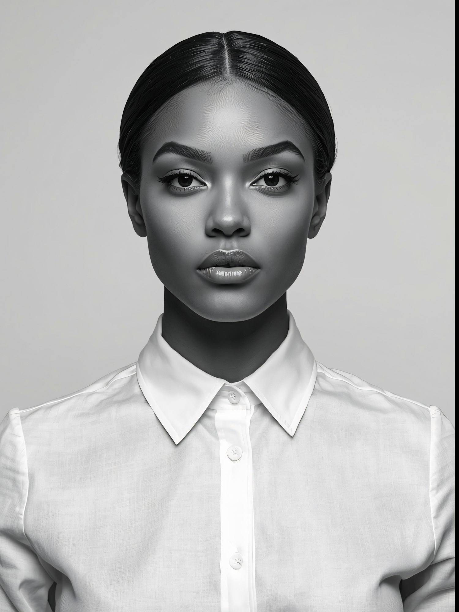 Monochrome portrait of a woman with a neat hairstyle and a white shirt, showcasing a clean and professional aesthetic.