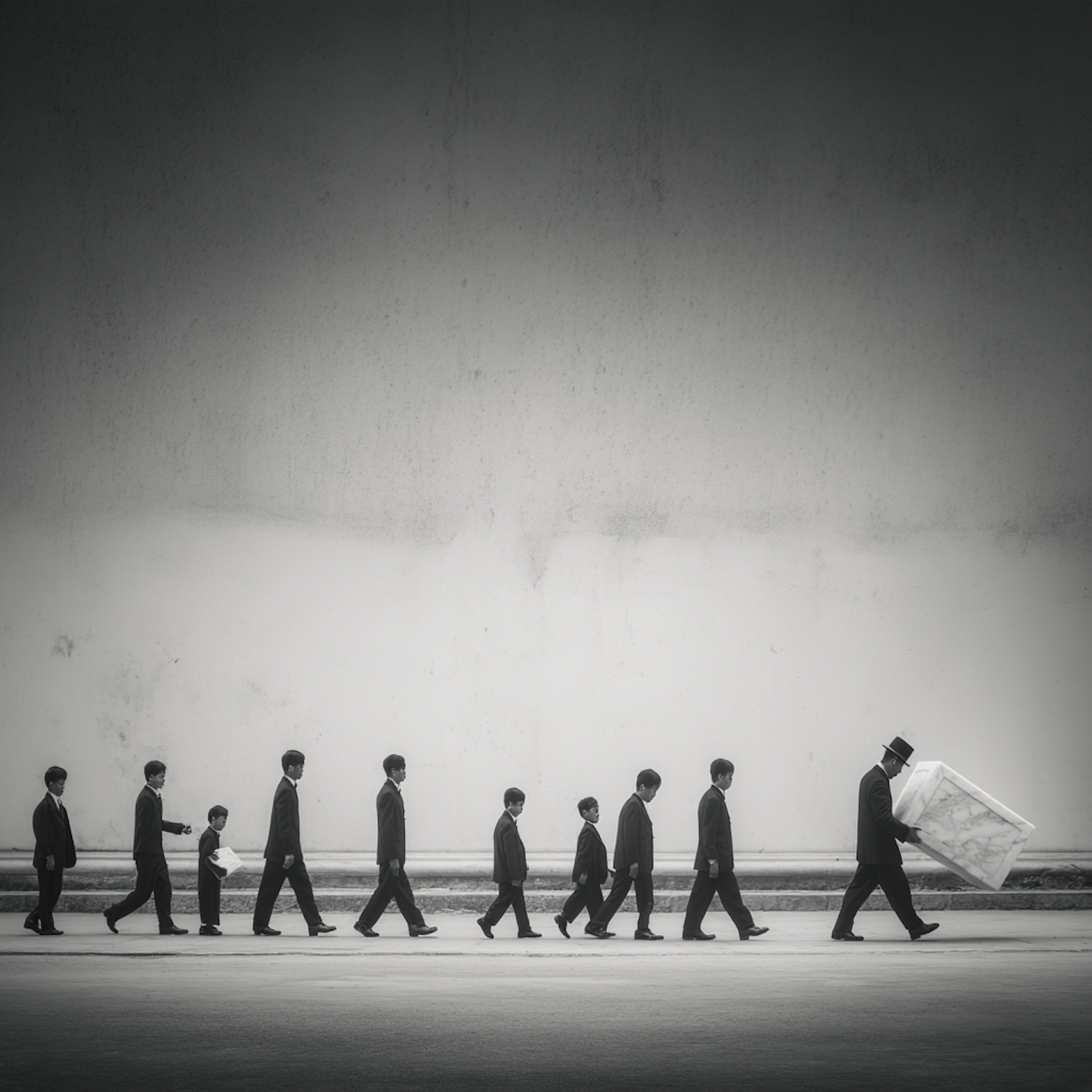 A black-and-white image of men and boys in suits walking in single file, led by a man carrying a marble-like block. Minimalist and symbolic.