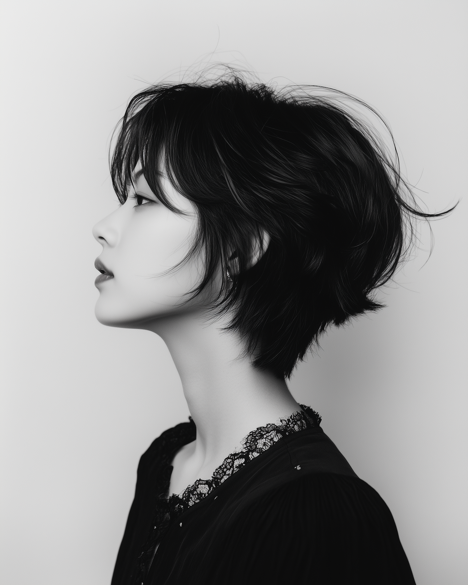 Black-and-white profile portrait of an Asian woman with short black hair, wearing a lace-detailed blouse, exuding elegance and introspection.