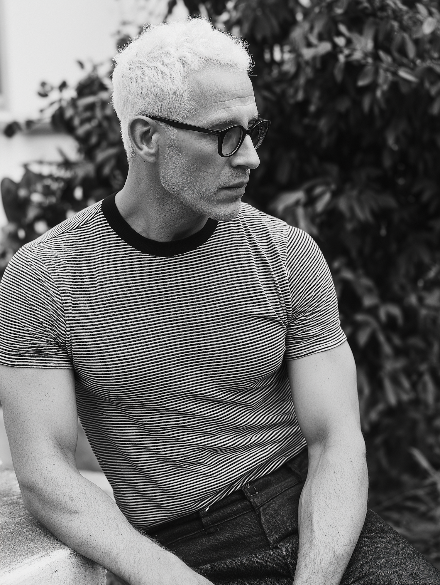 Black and white portrait of a handsome older man wearing a striped shirt and glasses, sitting outdoors with a thoughtful expression.