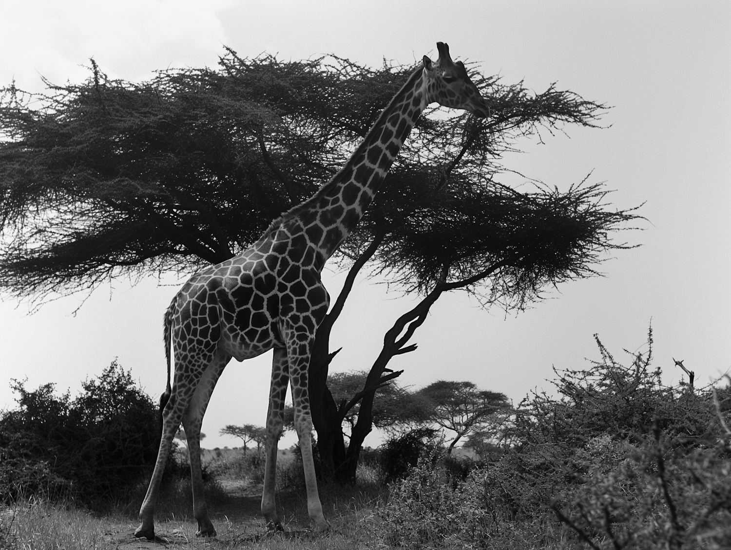 Monochrome image of a giraffe under an acacia tree in the savannah, showcasing its elegant form and distinctive patterns.