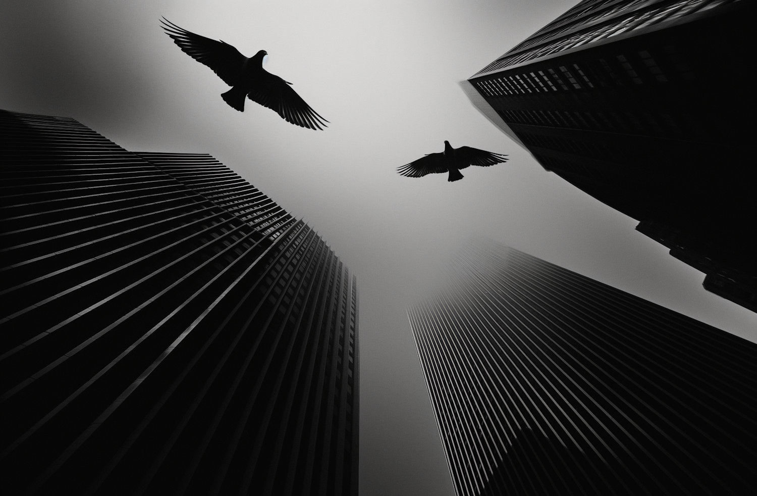 Black and white image of skyscrapers with birds in flight, creating a dramatic urban scene with strong architectural lines.