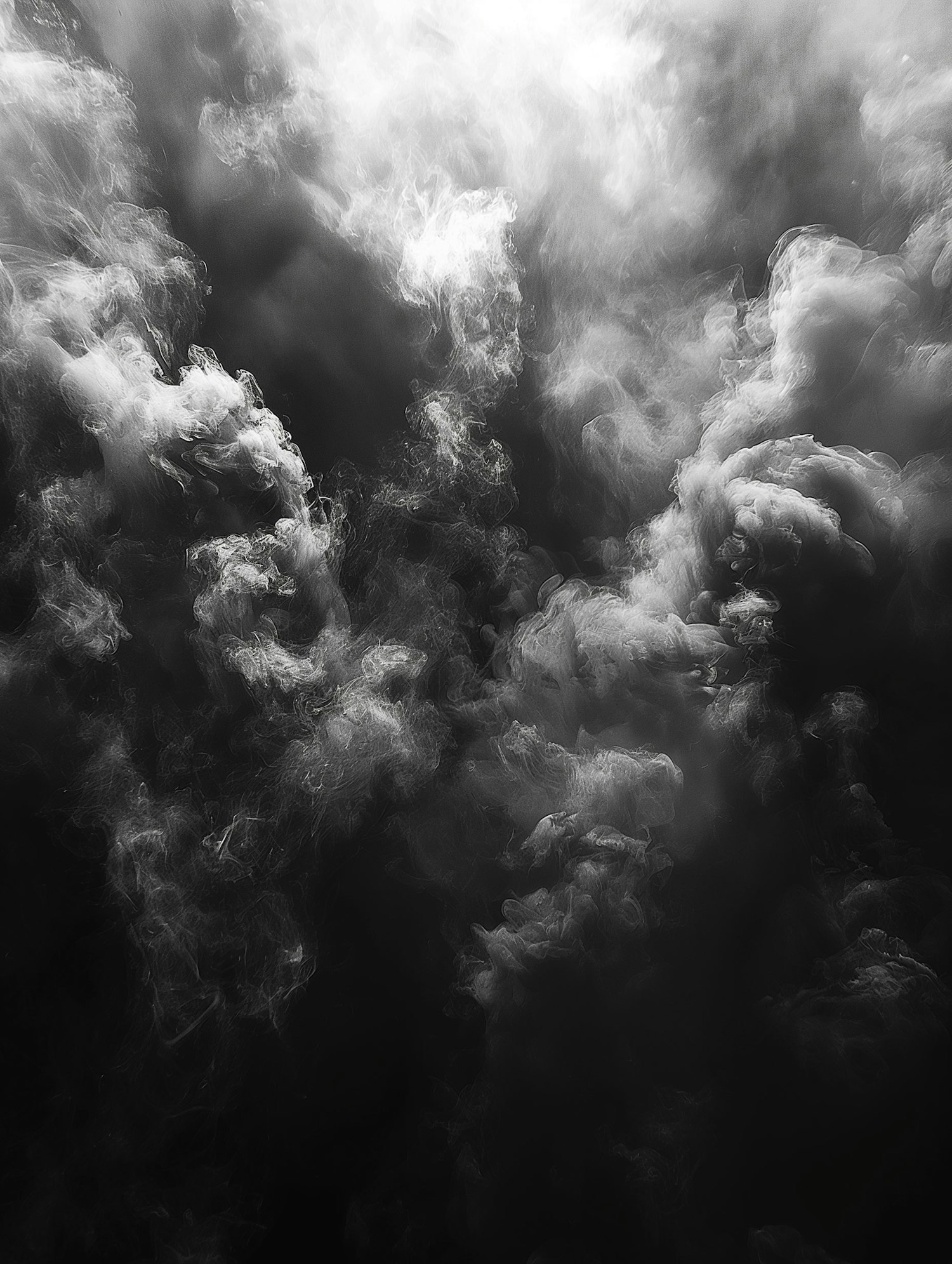 Dramatic swirling smoke clouds with intricate patterns and textures, highlighted by light and shadow, creating a mysterious atmosphere.