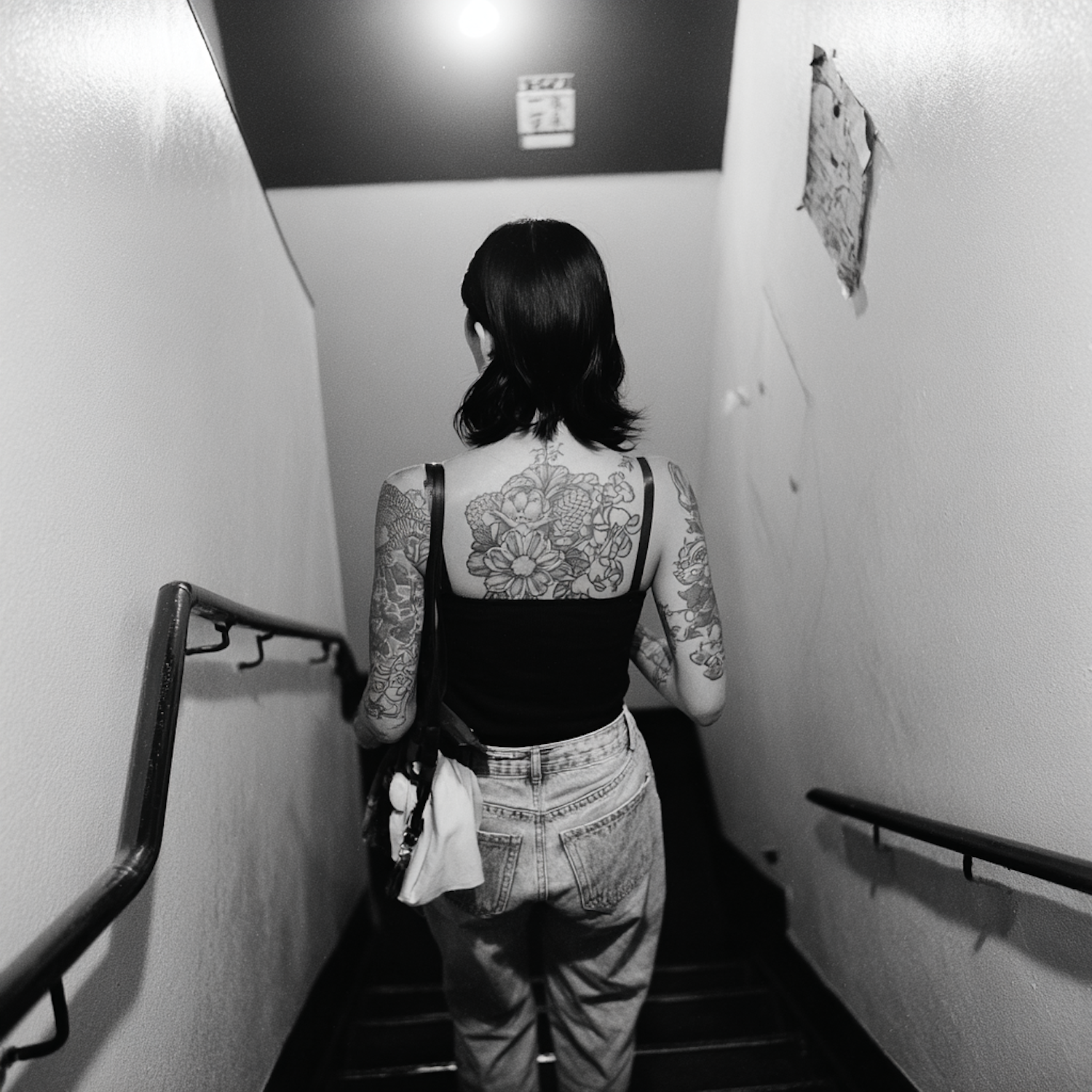 A stylishly tattooed individual walks down a dim stairwell, wearing casual attire. The monochrome captures a striking street photography vibe.