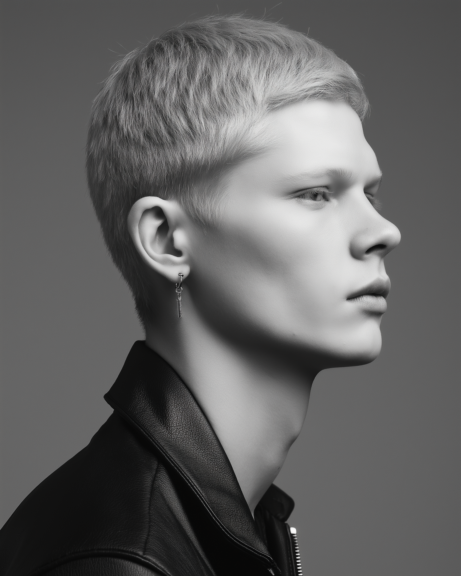 Monochrome profile portrait of a young person with short light hair, a leather jacket, and a dangling earring, exuding modern style.