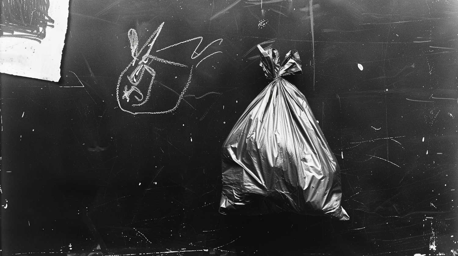 Black and white photo of a garbage bag hanging on a chalk-marked wall with a face drawing, creating a gritty, artistic scene.