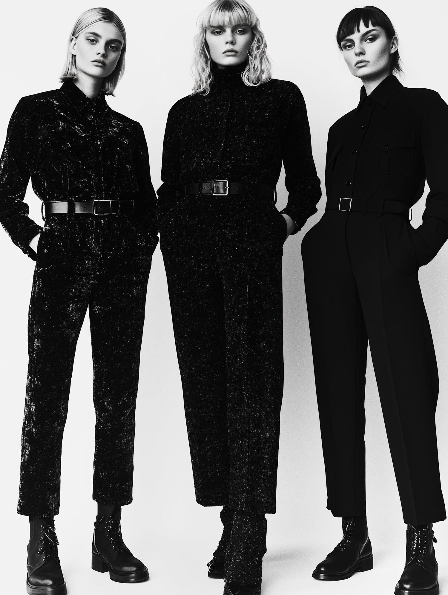 Three women in sleek black jumpsuits and boots, showcasing edgy monochromatic fashion with bold textures and clean lines.