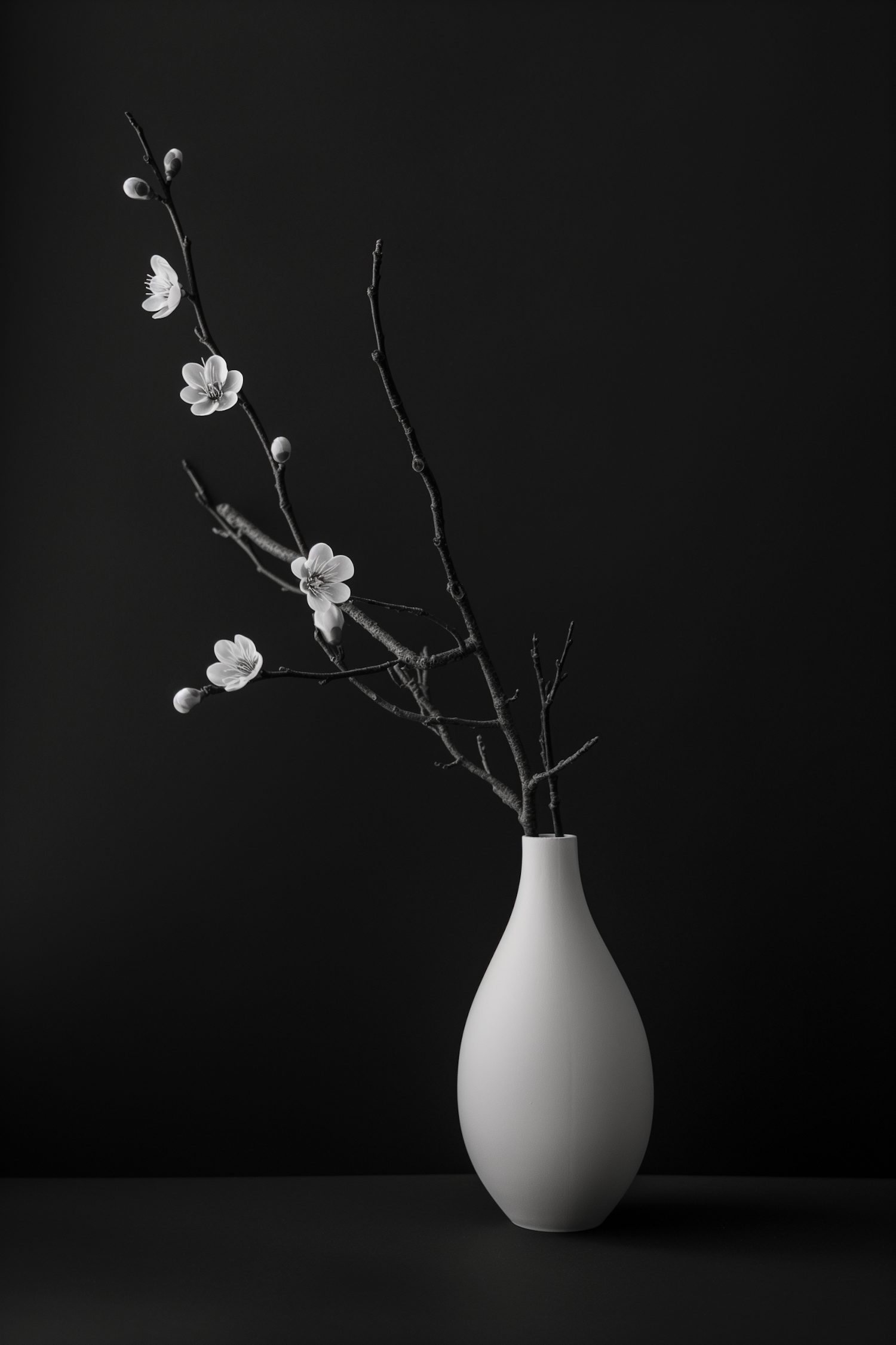 Minimalist black and white photo of a white vase with blossoming branches against a dark background, highlighting elegance and simplicity.