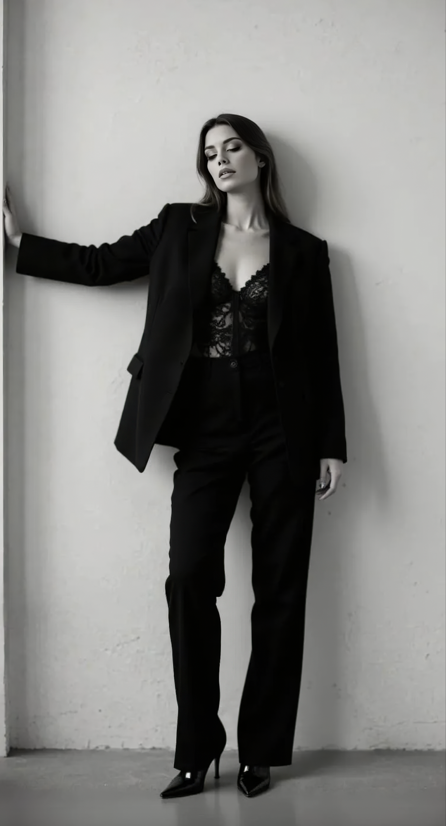 Stylish black-and-white portrait of a woman in a black suit and lace top, exuding elegance and sophistication.